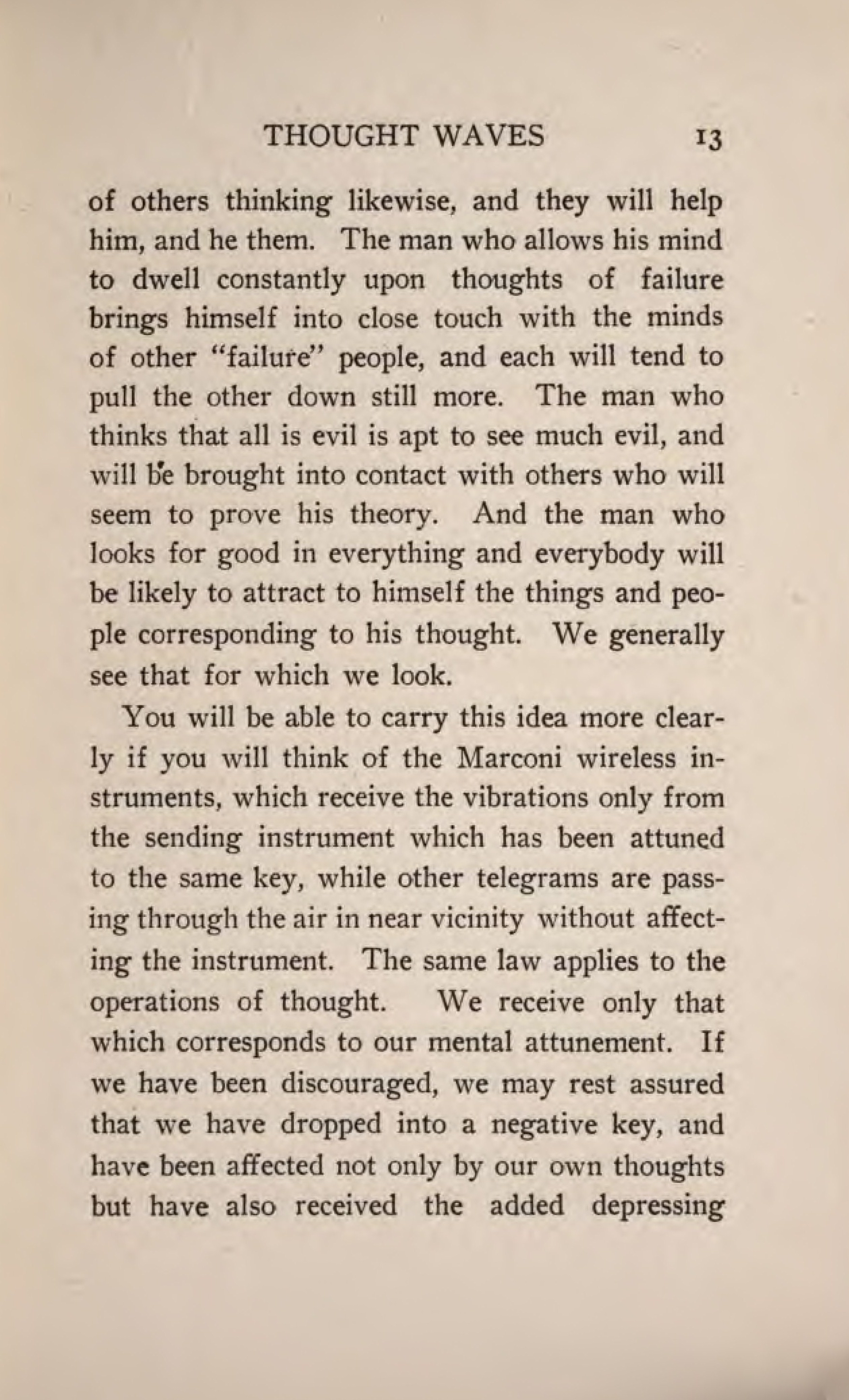 You will be able to carry this idea more clearly if you will think of the Marconi wireless instruments, which receive the vibrations only from the sending instrument which has been attuned to the same key, while other telegrams are passing through the air in near vicinity without affecting the instrument. The same law applies to the operations of thought. We receive only that which corresponds to our mental attunement. If we have been discouraged, we may rest assured that we have dropped into a negative key, and have been affected not only by our own thoughts but have also received the added depressing
