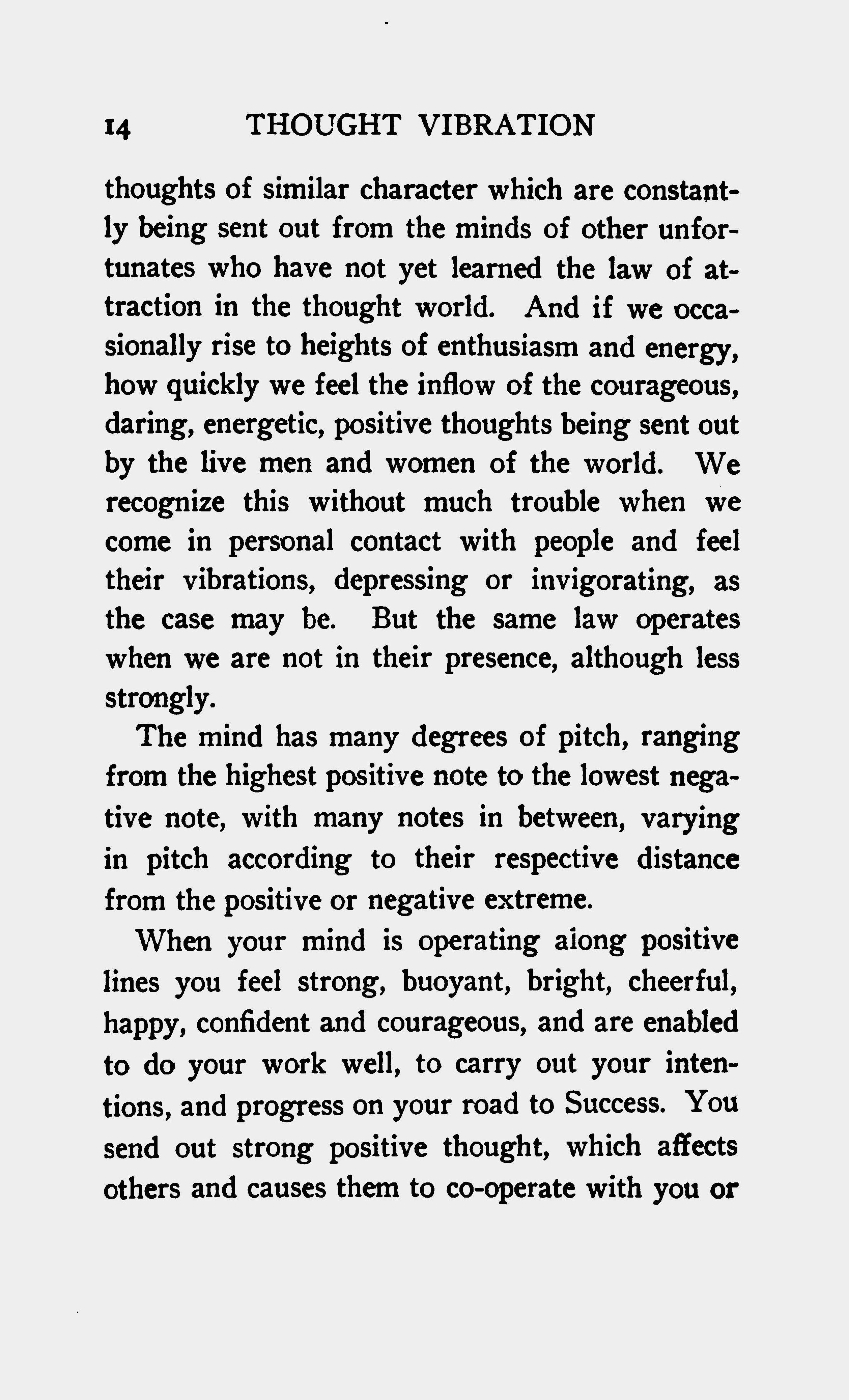 thoughts of similar character which are constantly being sent out from the minds of other unfortunates who have not yet learned the law of attraction in the thought world. And if we occasionally rise to heights of enthusiasm and energy, how quickly we feel the inflow of the courageous, daring, energetic, positive thoughts being sent out by the live men and women of the world. We recognize this without much trouble when we come in personal contact with people and feel their vibrations, depressing or invigorating, as the case may be. But the same law operates when we are not in their presence, although less strongly.