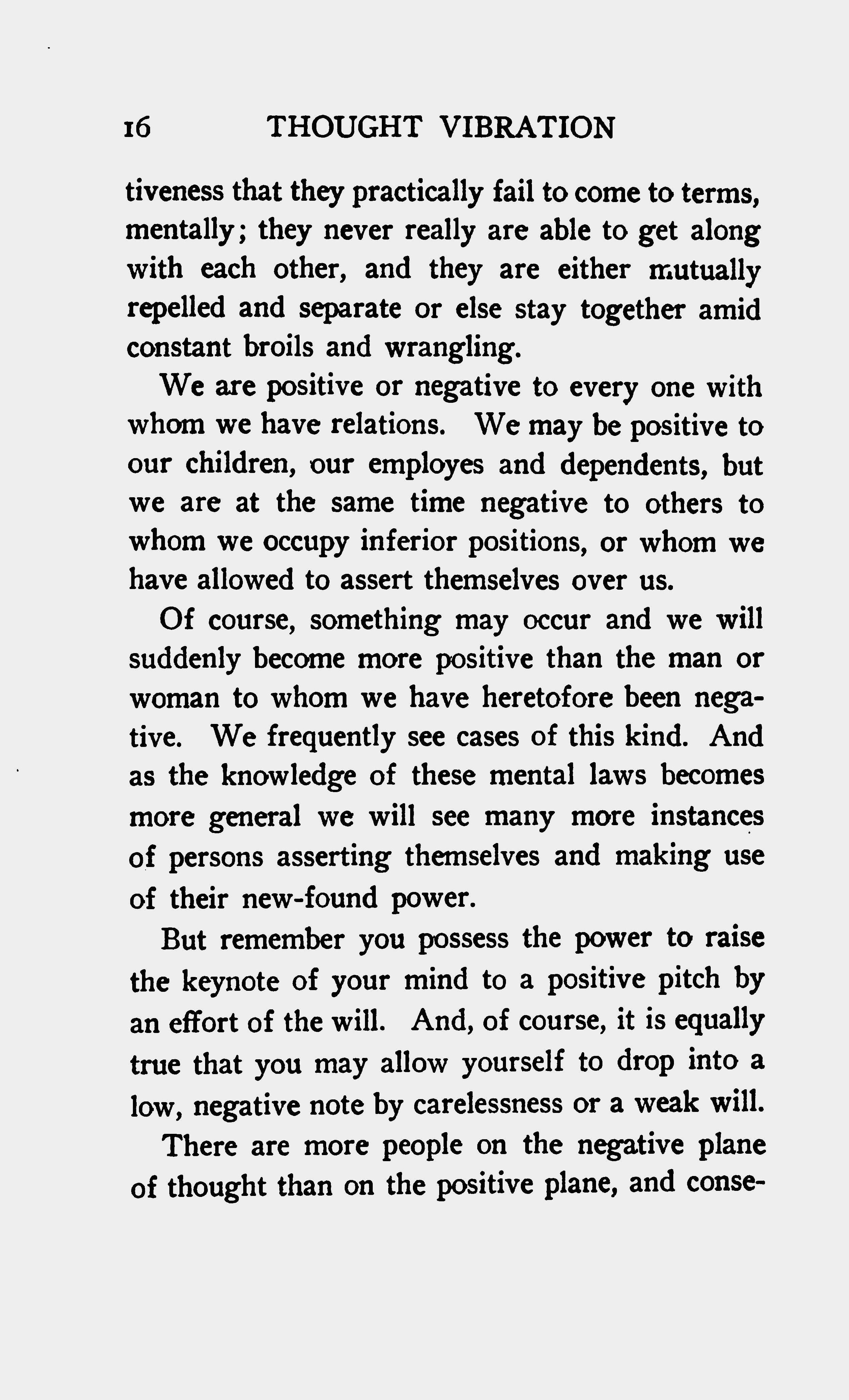 We are positive or negative to everyone with whom we have relations. We may be positive to our children, our employees and dependents, but we are at the same time negative to others to whom we occupy inferior positions, or whom we have allowed to assert themselves over us.