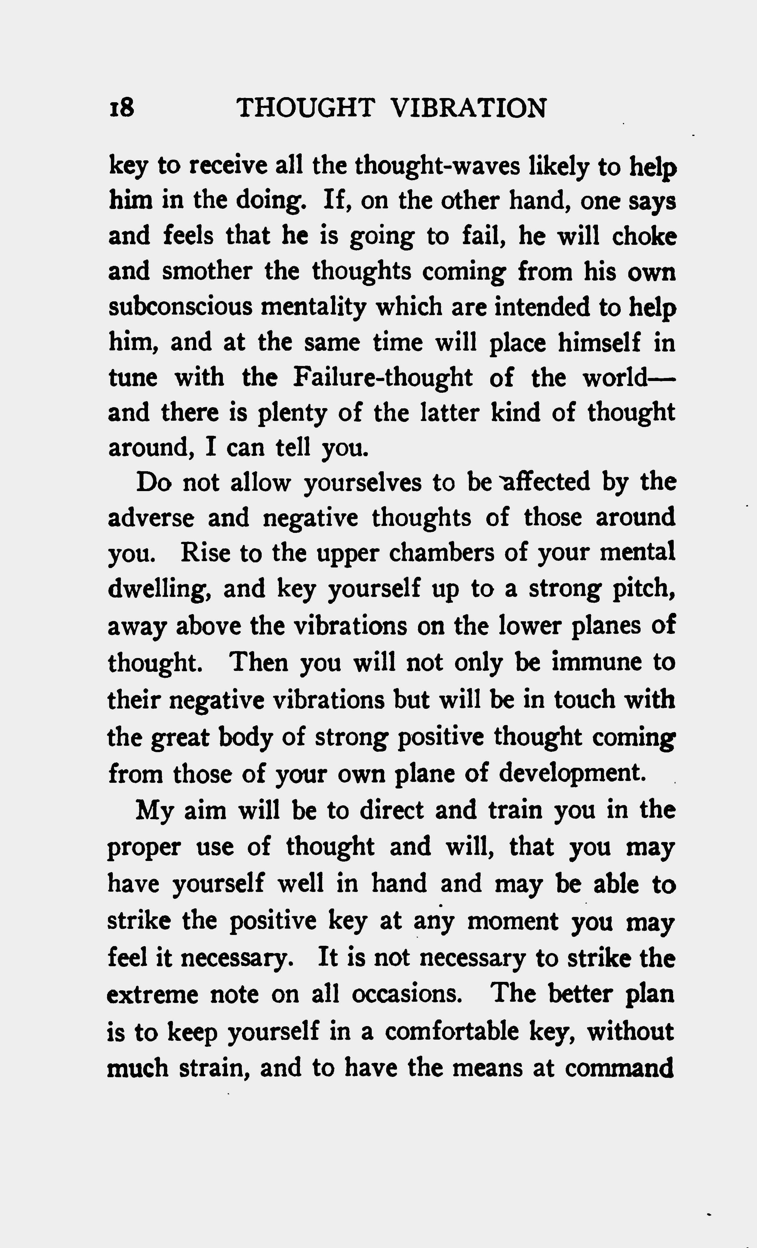 My aim will be to direct and train you in the proper use of thought and will, that you may have yourself well in hand and may be able to strike the positive key at any moment you may feel it necessary. It is not necessary to strike the extreme note on all occasions. The better plan is to keep yourself in a comfortable key, without much strain, and to have the means at command