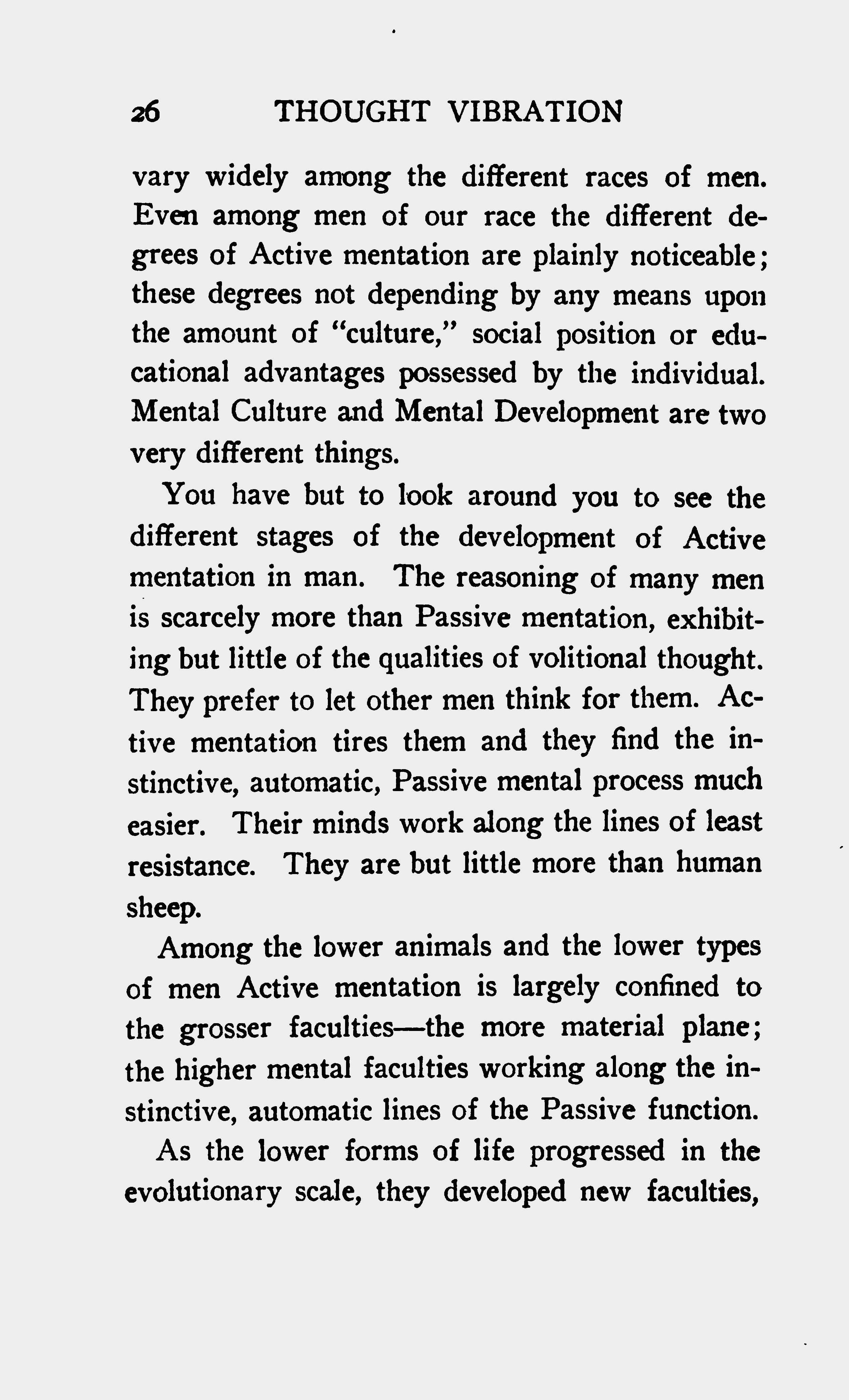 You have but to look around you to see the different stages of the development of Active mentation in man. The reasoning of many men is scarcely more than Passive mentation, exhibiting but little of the qualities of volitional thought. They prefer to let other men think for them. Active mentation tires them and they find the instinctive, automatic, Passive mental process much easier. Their minds work along the lines of least resistance. They are but little more than human sheep,