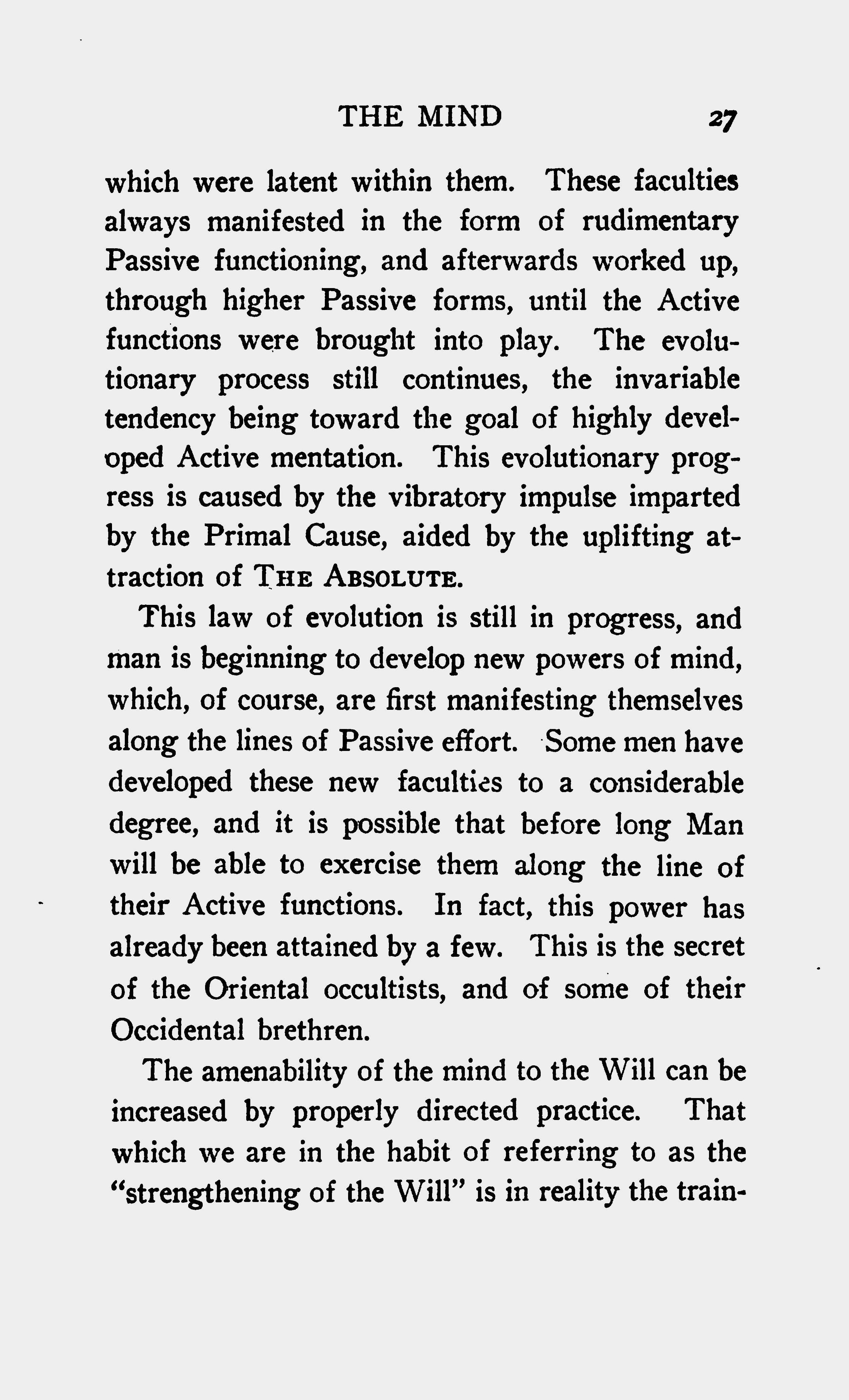 which were latent within them. These faculties always manifested in the form of rudimentary Passive functioning, and afterwards worked up through higher Passive forms, until the Active functions were brought into play. The evolutionary process still continues, the invariable tendency being toward the goal of highly developed Active mentation. This evolutionary progress is caused by the vibratory impulse imparted by the Primal Cause, aided by the uplifting attraction of THE ABSOLUTE.