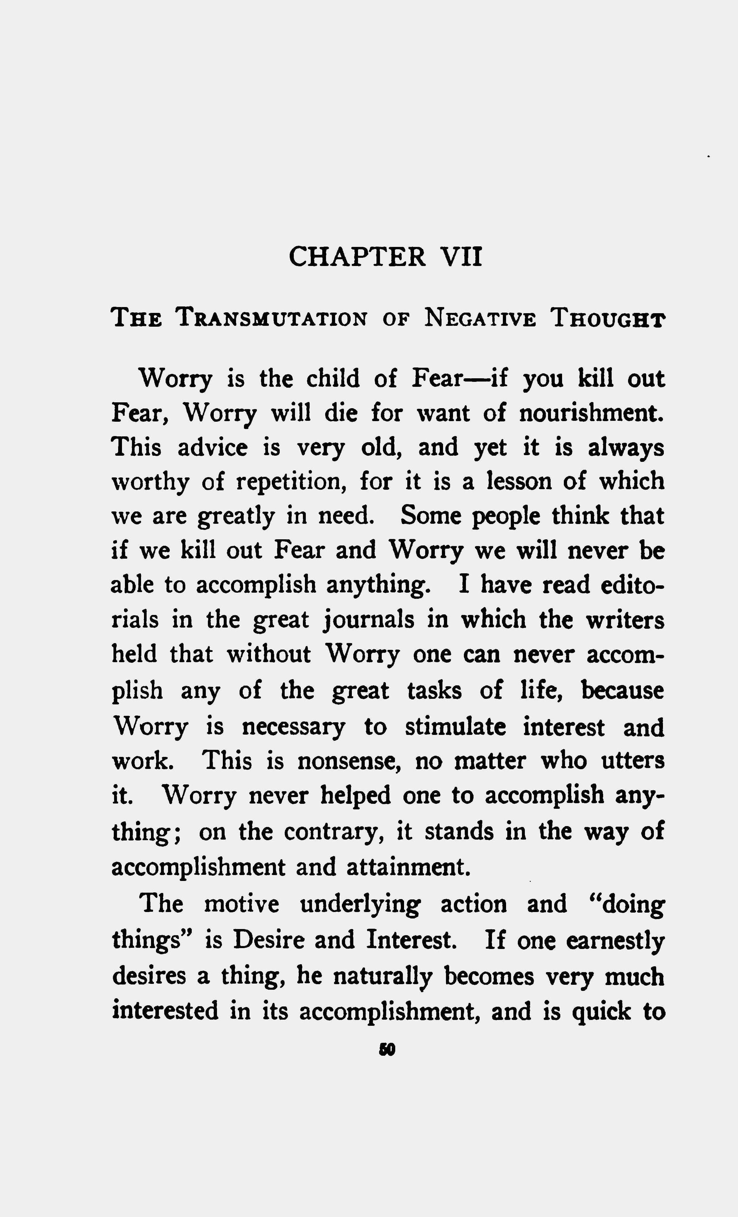 WORRY is the child of Fear - if you kill out Fear, Worry will die for want of nourishment. This advice is very old, and yet it is always worthy of repetition, for it is a lesson of which we are greatly in need. Some people think that if we kill out Fear and Worry we will never be able to accomplish anything. I have read editorials in the great journals in which the writers held that without Worry one can never accomplish any of the great tasks of life, because Worry is necessary to stimulate interest and work. This is nonsense, no matter who utters it. Worry never helped one to accomplish anything; on the contrary, it stands in the way of accomplishment and attainment.