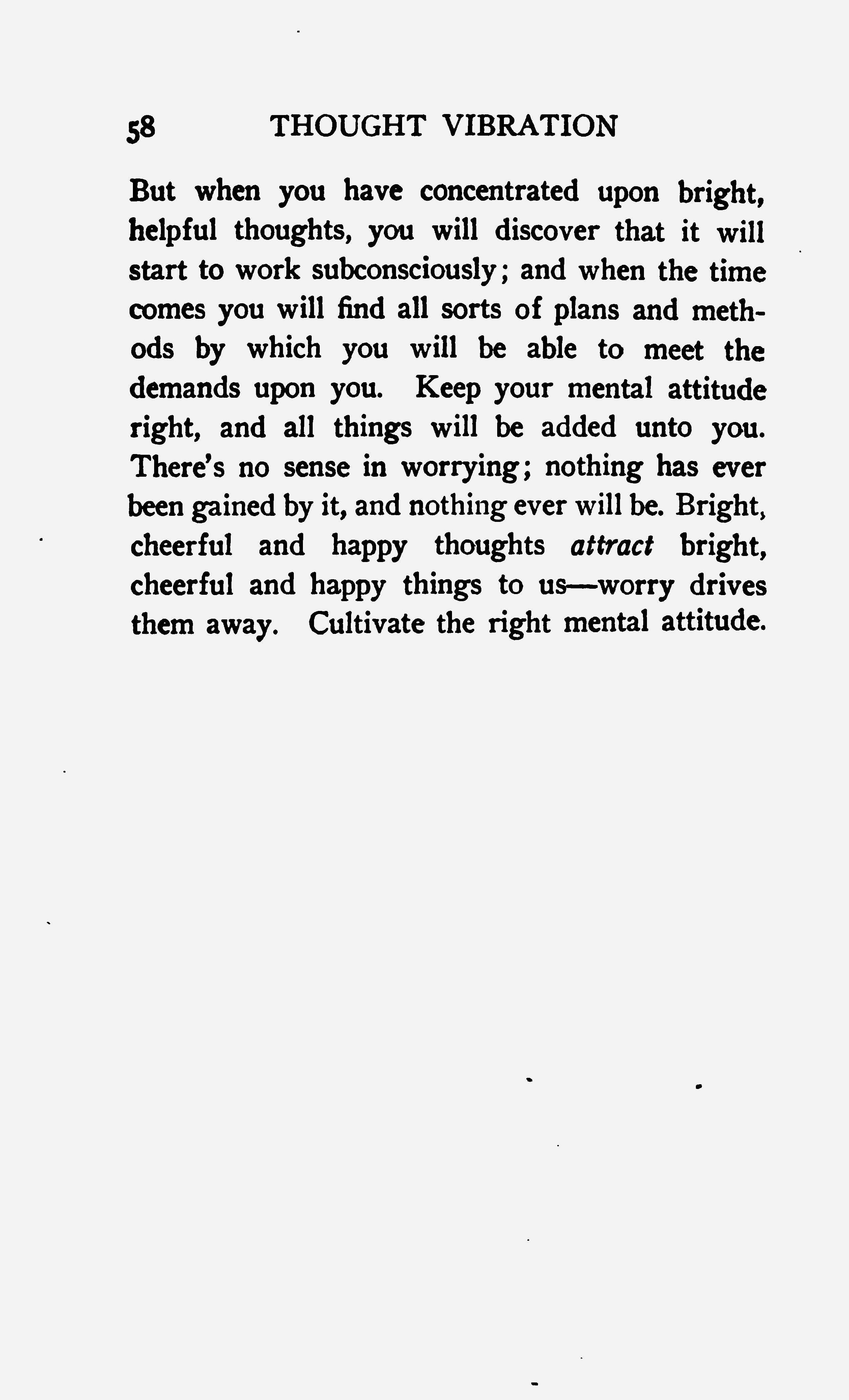 But when you have concentrated upon bright, helpful thoughts, you will discover that it will start to work subconsciously; and when the time comes you will find all sorts of plans and methods by which you will be able to meet the demands upon you. Keep your mental attitude right, and all things will be added unto you. There's no sense in worrying; nothing has ever been gained by it, and nothing ever will be. Bright, cheerful and happy thoughts attract bright, cheerful and happy things to us - worry drives them away. Cultivate the right mental attitude.