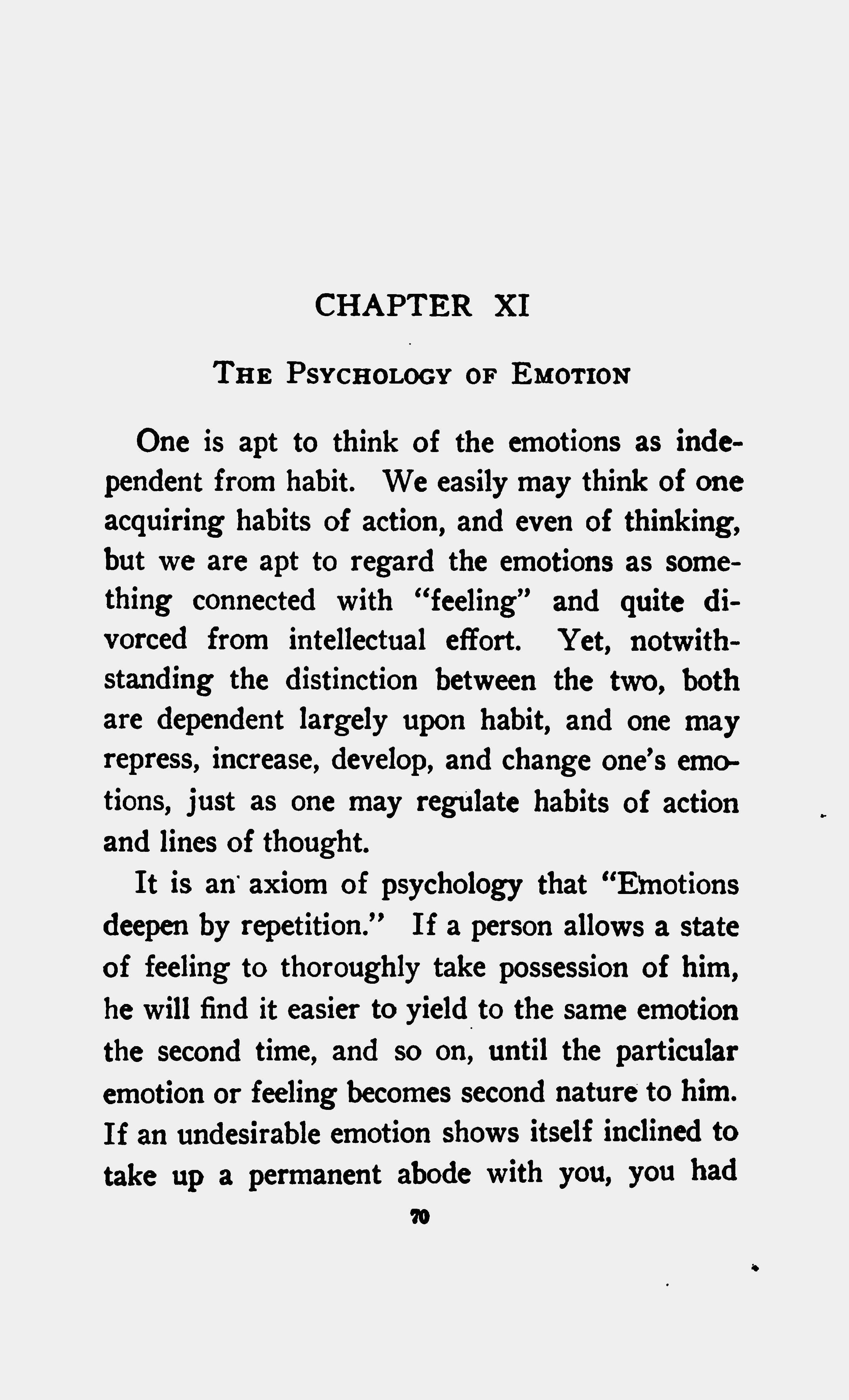 It is an axiom of psychology that "Emotions deepen by repetition." If a person allows a state of feeling to thoroughly take possession of him, he will find it easier to yield to the same emotion the second time, and so on, until the particular emotion or feeling becomes second nature to him. If an undesirable emotion shows itself inclined to take up a permanent abode with you, you had