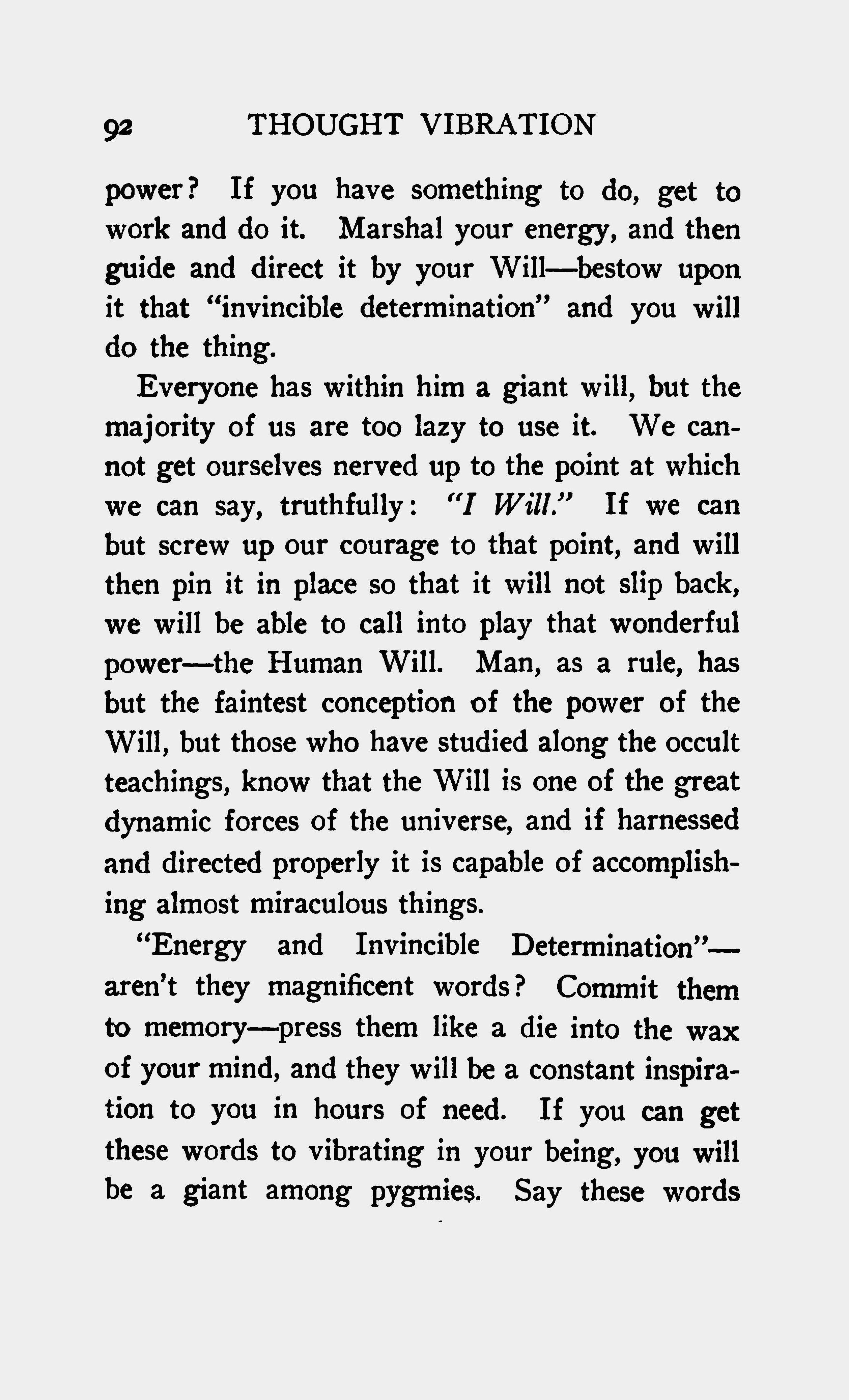 "Energy and Invincible Determination: -- aren't they magnificent words? Commit them to memory - press them like a die into the wax of your mind, and they will be a constant inspiration to you in hours of need. If you can get these words to vibrating in your being, you will be a giant among pygmies. Say these words