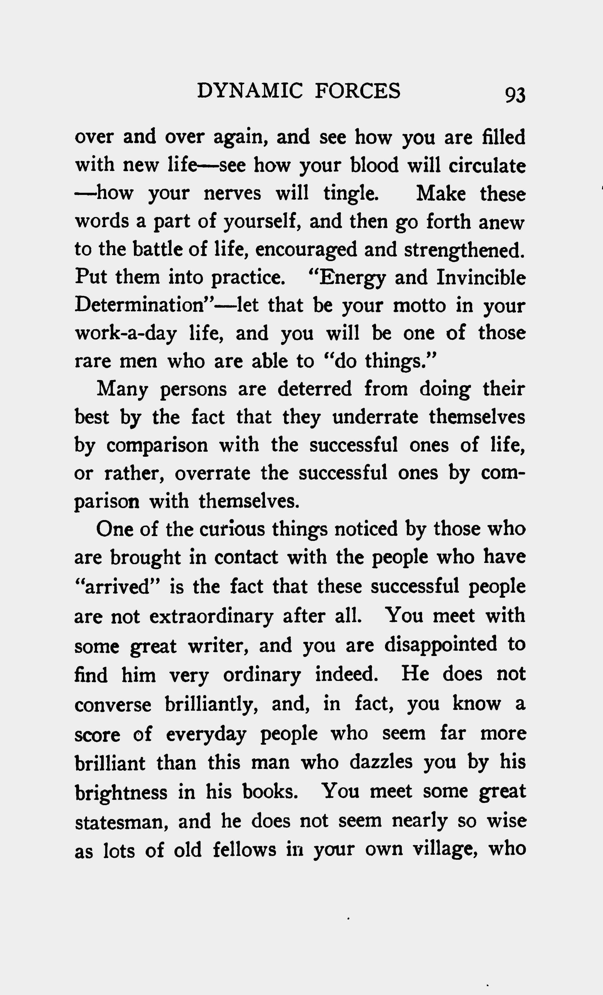 over and over again, and see how you are filled with new life - see how your blood will circulate - how your nerves will tingle. Make these words a part of yourself, and then go forth anew to the battle of life, encouraged and strengthened. Put them into practice. "Energy and Invincible Determination" - let that be your motto in your work-a-day life, and you will be one of those rare men who are able to "do things."