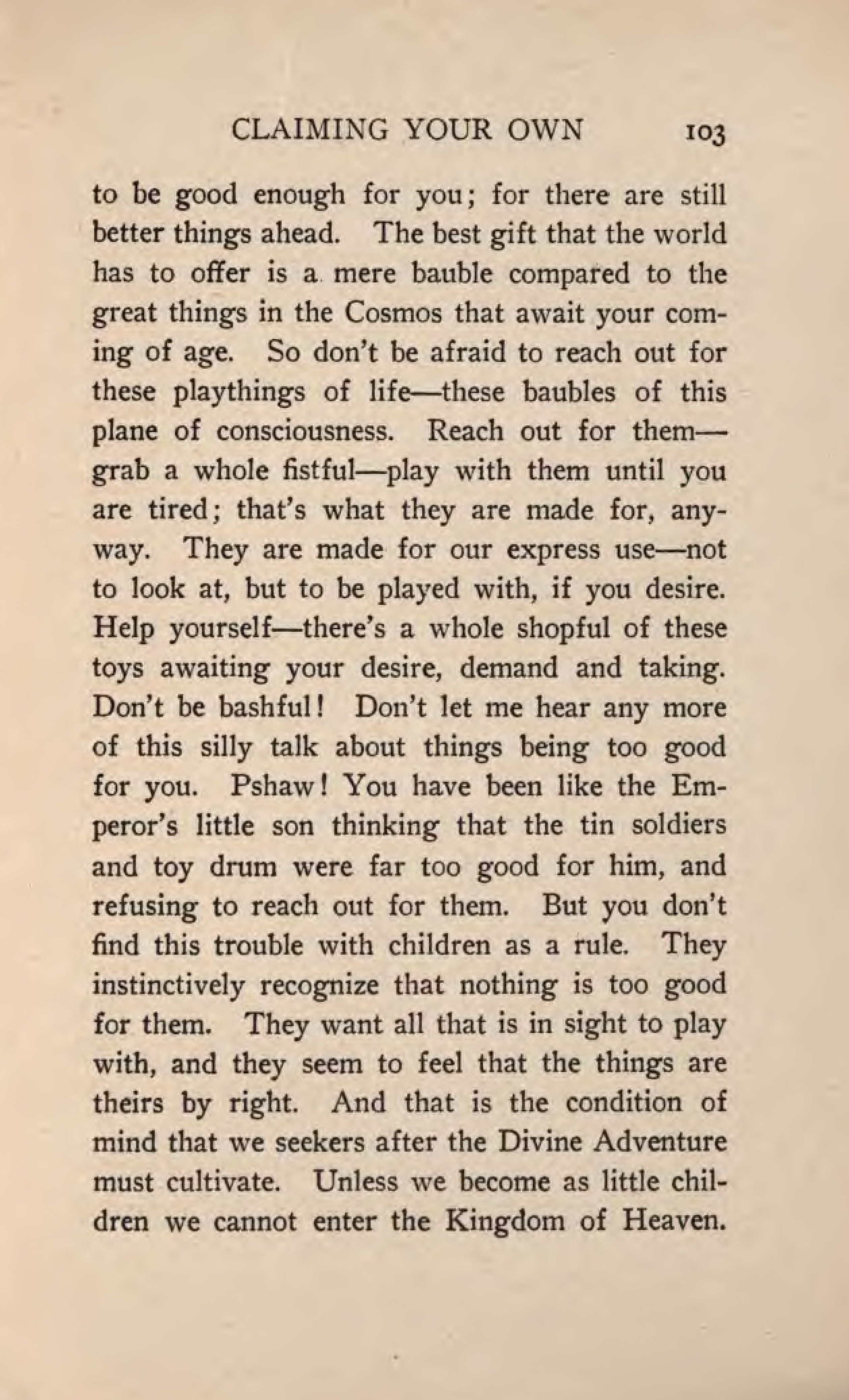 to be good enough for you; for there are still better things ahead. The best gift that the world has to offer is a mere bauble compared to the great things in the Cosmos that await your coming of age. So don't be afraid to reach out for these playthings of life - these baubles of this plane of consciousness. Reach out for them - grab a whole fistful - play with them until you are tired; that's what they are made for, anyway. They are made for our express use - not to look at, but to be played with, if you desire. Help yourself - there's a whole shopful of these toys awaiting your desire, demand and taking. Don't be bashful! Don't let me hear any more of this silly talk about things being too good for you. Pshaw! You have been like the Emperor's little son thinking that the tin soldiers and toy drum were far too good for him, and refusing to reach out for them. But you don't find this trouble with children as a rule. They instinctively recognize that nothing is too good for them. They want all that is in sight to play with, and they seem to feel that the things are theirs by right. And that is the condition of mind that we seekers after the Divine Adventure must cultivate. Unless we become as little children we cannot enter the Kingdom of Heaven.