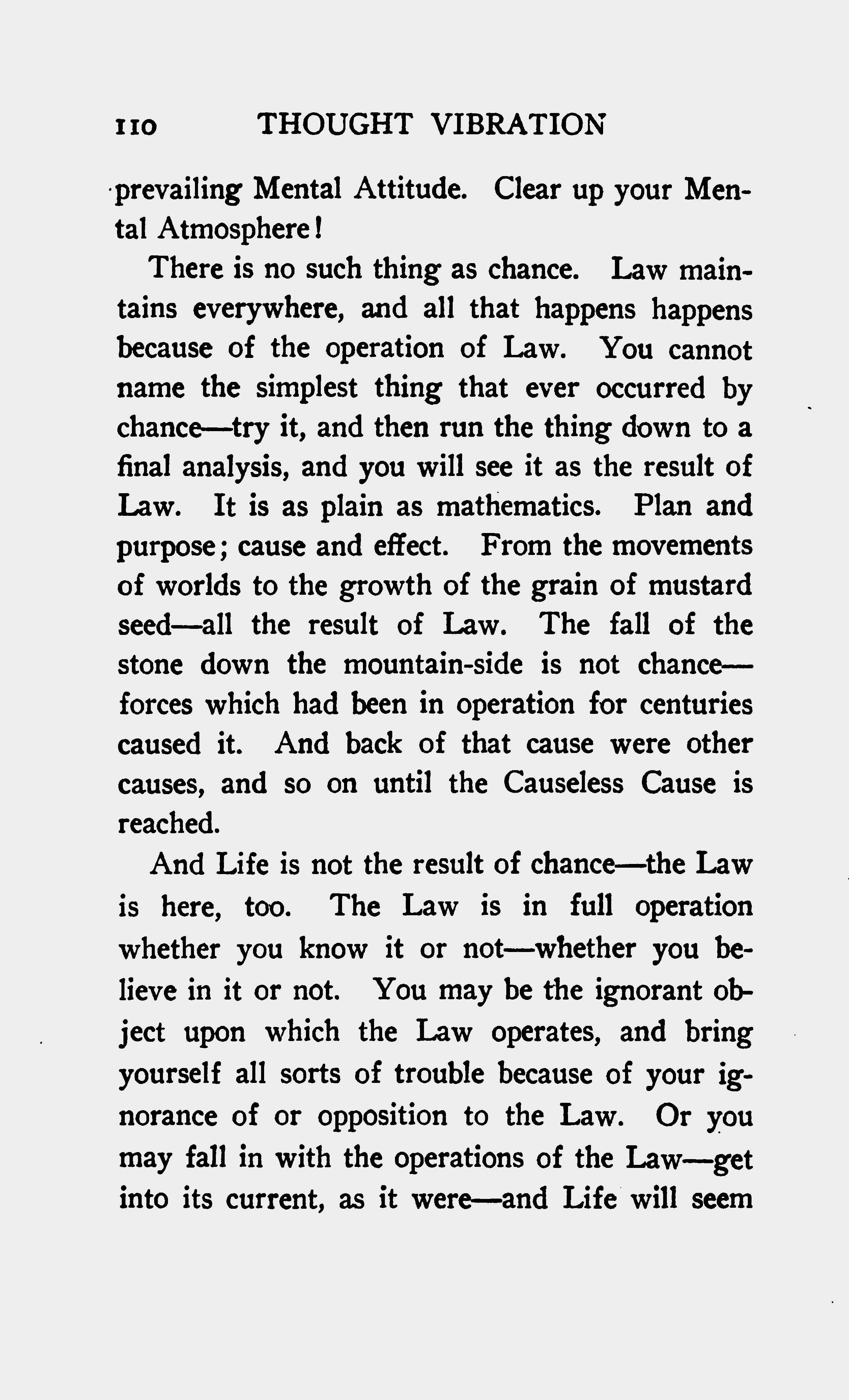 And Life is not the result of chance - the Law is here, too. The Law is in full operation whether you know it or not - whether you believe in it or not. You may be the ignorant object upon which the Law operates, and bring yourself all sorts of trouble because of your ignorance of or opposition to the Law. Or you may fall in with the operations to the Law - get into its current, as it were - and Life will seem