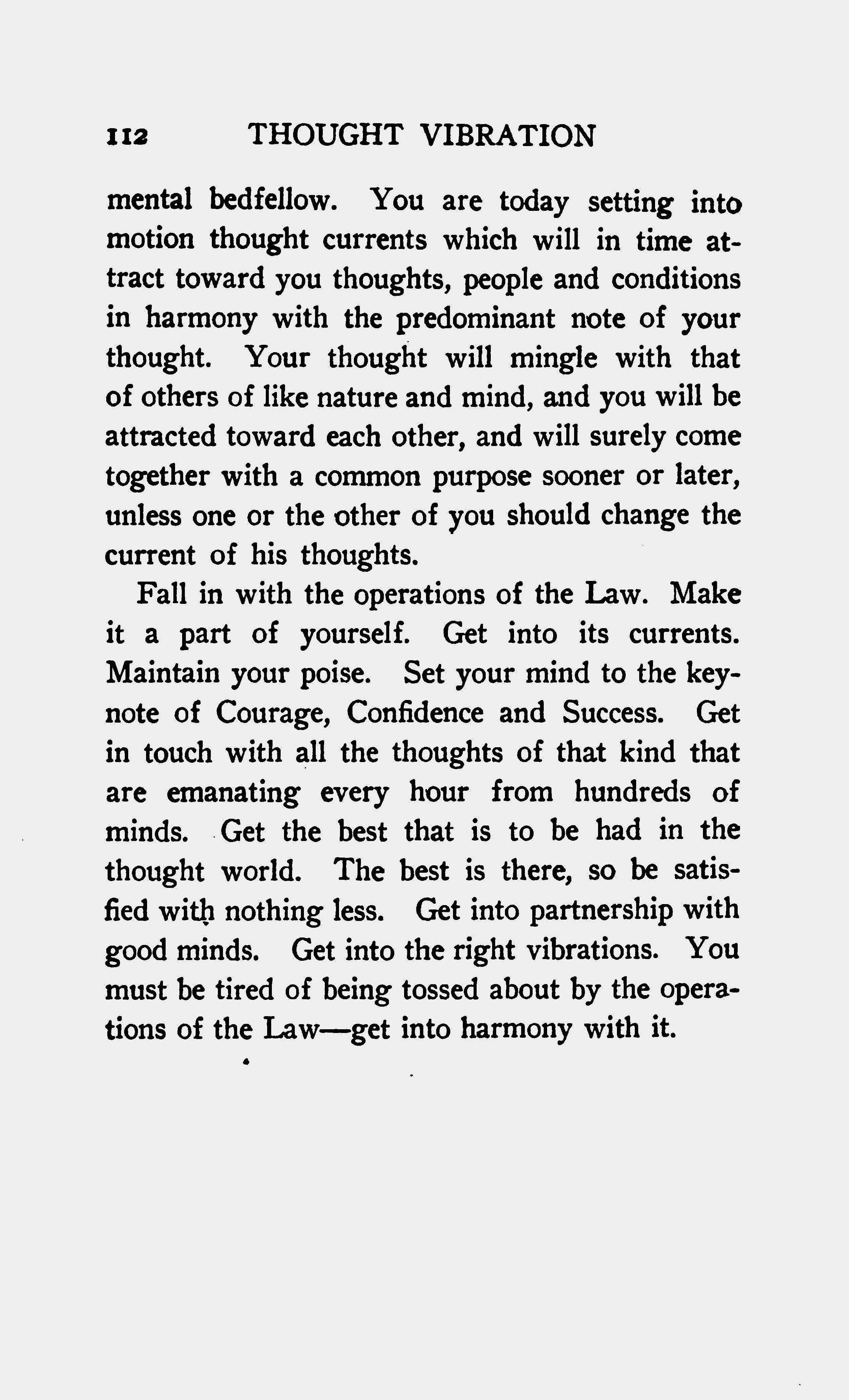 Fall in with the operations of the law. Make it a part of yourself. Get into its currents. Maintain your poise. Set your mind to the keynote of Courage, Confidence and Success. Get in touch with all the thoughts of that kind that are emanating every hour from hundreds of minds. Get the best that is to be had in the thought world. The best is there, so be satisfied with nothing less. Get into partnership with good minds. Get into the right vibrations. You must be tired of being tossed about by the operations of the Law - get into harmony with it.