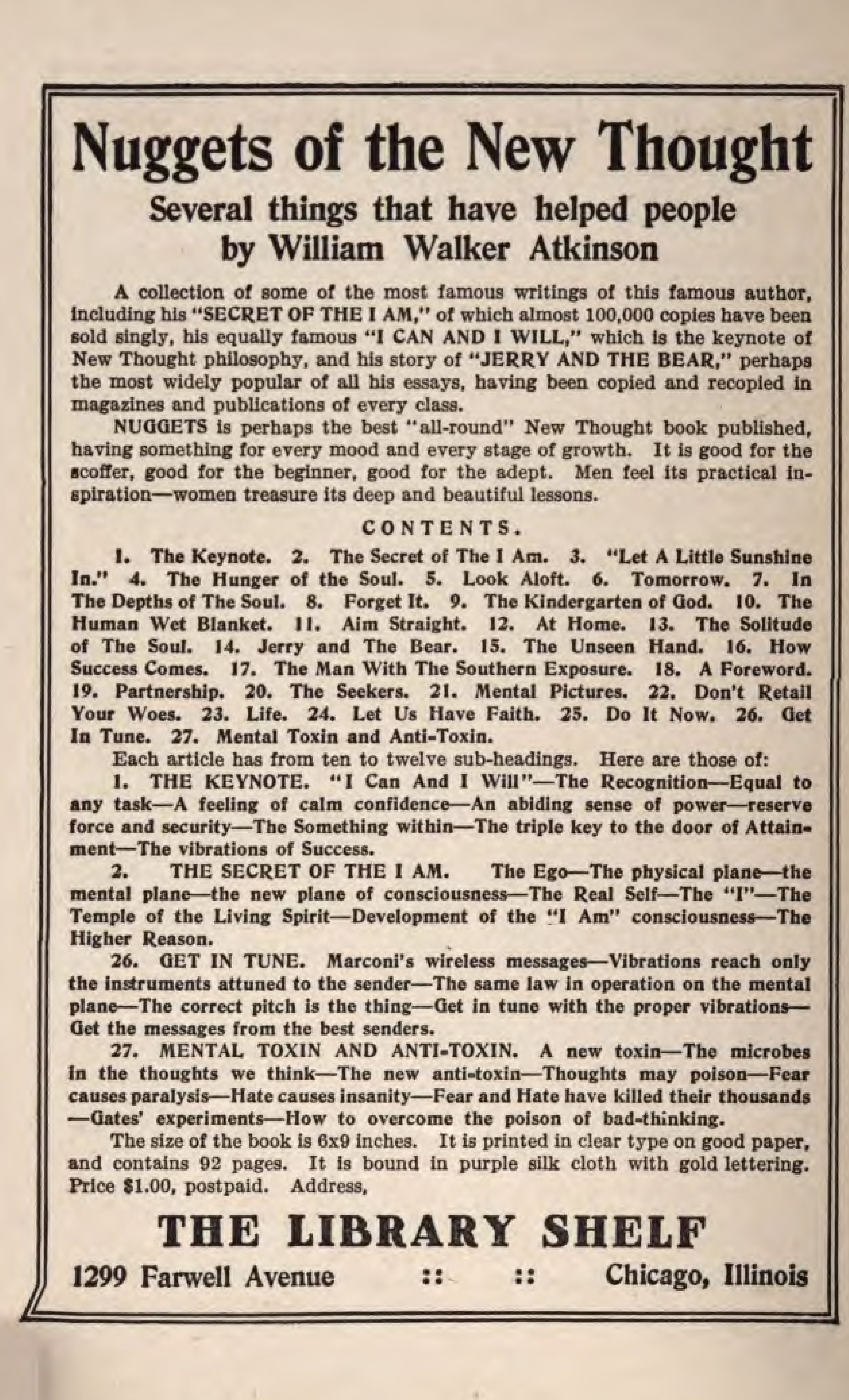 Preface - Foreword - My Working Creed - Law of Attraction in the Thought World - Thought Waves and Their Process of Reproduction - A Talk About The Mind - Mind Building - Secret of the Will - How to Become Immune to Injurious Thought Attraction - Transmutation of Negative Thought - Law of Mental Control - Asserting the Life-Force - Training the Habit-Mind - Psychology of Emotion - Developing New Brain Cells - Attractive Power - Desire Force - Great Dynamic Forces - Claiming Your Own - Law, Not Chance - Contents