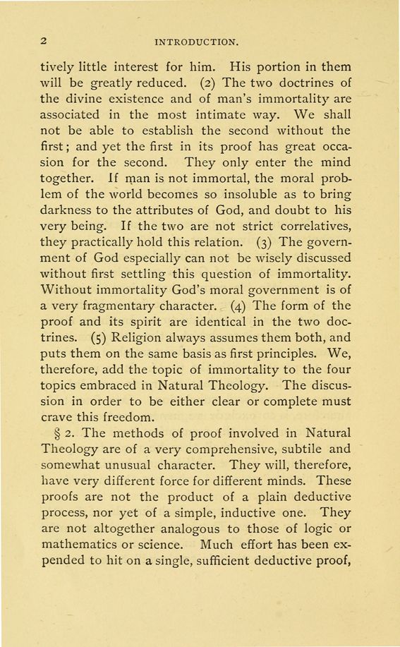 § 2. The methods of proof involved in Natural Theology are of a very comprehensive, subtile and somewhat unusual character. They will, therefore, have very different force for different minds. These proofs are not the product of a plain deductive process, nor yet of a simple, inductive one. They are not altogether analogous to those of logic or mathematics or science. Much effort has been expended to hit on a single, sufficient deductive proof,