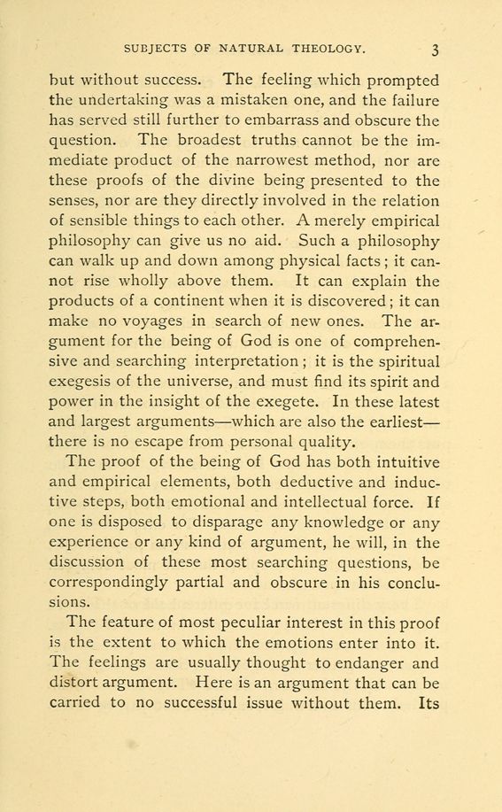 but without success. The feeling which prompted the undertaking was a mistaken one, and the failure has served still further to embarrass and obscure the question. The broadest truths cannot be the immediate product of the narrowest method, nor are these proofs of the divine being presented to the senses, nor are they directly involved in the relation of sensible things to each other. A merely empirical philosophy can give us no aid. Such a philosophy can walk up and down among physical facts; it cannot rise wholly above them. It can explain the products of a continent when it is discovered; it can make no voyages in search of new ones. The argument for the being of God is one of comprehensive and searching interpretation; it is the spiritual exegesis of the universe, and must find its spirit and power in the insight of the exegete. In these latest and largest arguments --- which are also the earliest --- there is no escape from personal quality.