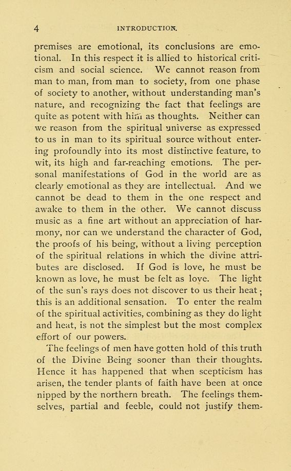 premises are emotional, its conclusions are emotional. In this respect it is allied to historical criticism and social science. We cannot reason from man to man, from man to society, from one phase of society to another, without understanding man's nature, and recognizing the fact that feelings are quite as potent with as thoughts. Neither can we reason from the spiritual universe as expressed to us in man to its spiritual source without entering profoundly into its most distinctive feature, to wit, its high and far-reaching emotions. The personal manifestations of God in the world are as clearly emotional as they are intellectual. And we cannot be dead to them in the one respect and awake to them in the other. We cannot discuss music as a fine art without an appreciation of harmony, nor can we understand the character of God, the proofs of his being, without a living perception of the spiritual relations in which the divine attributes are disclosed. If God is love, he must be known as love, he must be felt as love. The light of the sun's rays does not discover to us their heat this is an additional sensation. To enter the realm of the spiritual activities, combining as they do light and heat, is not the simplest but the most complex effort of our powers.