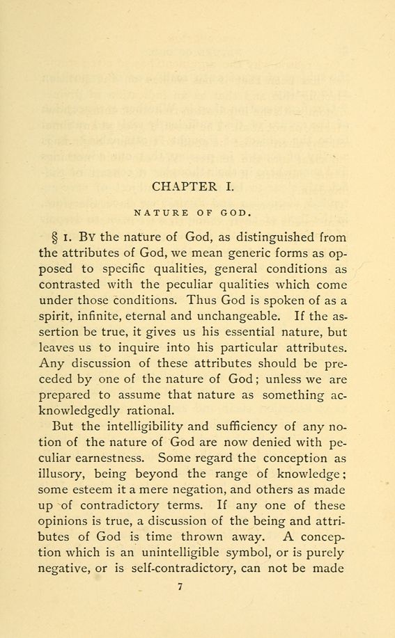 § 1. BY the nature of God, as distinguished from the attributes of God, we mean generic forms as opposed to specific qualities, general conditions as contrasted with the peculiar qualities which come under those conditions. Thus God is spoken of as a spirit, infinite, eternal and unchangeable. If the assertion be true, it gives us his essential nature, but leaves us to inquire into his particular attributes. Any discussion of these attributes should be preceded by one of the nature of God; unless we are prepared to assume that nature as something acknowledgedly rational.