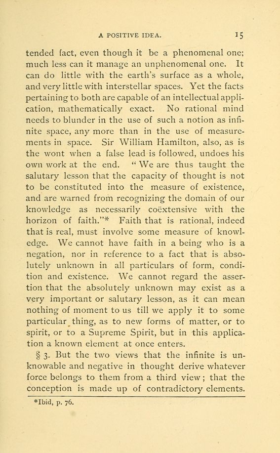 fact, even though it be a phenomenal one; much less can it manage an unphenomenal one. It can do little with the earth's surface as a whole, and very little with interstellar spaces. Yet the facts pertaining to both are capable of an intellectual application, mathematically exact. No rational mind needs to blunder in the use of such a notion as infinite space, any more than in the use of measurements in space. Sir William Hamilton, also, as is the wont when a false lead is followed, undoes his own work at the end. "We are thus taught the salutary lesson that the capacity of thought is not to be constituted into the measure of existence, and are warned from recognizing the domain of our knowledge as necessarily coextensive with the horizon of faith."* Faith that is rational, indeed that is real, must involve some measure of knowledge. We cannot have faith in a being who is a negation, nor in reference to a fact that is absolutely unknown in all particulars of form, condition and existence. We cannot regard the assertion that the absolutely unknown may exist as a very important or salutary lesson, as it can mean nothing of moment to us till we apply it to some particular thing, as to new forms of matter, or to spirit, or to a Supreme Spirit, but in this application a known element at once enters.