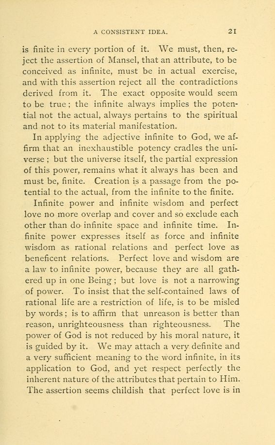 is finite in every portion of it. We must, then, reject the assertion of Mansel, that an attribute, to be conceived as infinite, must be in actual exercise, and with this assertion reject all the contradictions derived from it. The exact opposite would seem to be true; the infinite always implies the potential not the actual, always pertains to the spiritual and not to its material manifestation.