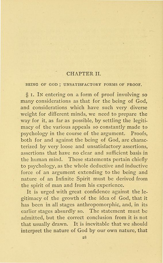 §1. IN entering on a form of proof involving so many considerations as that for the being of God, and considerations which have such very diverse weight for different minds, we need to prepare the way for it, as far as possible, by settling the legitimacy of the various appeals so constantly made to psychology in the course of the argument. Proofs, both for and against the being of God, are characterized by very loose and unsatisfactory assertions, assertions that have no clear and sufficient basis in the human mind. These statements pertain chiefly to psychology, as the whole deductive and inductive force of an argument extending to the being and nature of an Infinite Spirit must be derived from the spirit of man and from his experience.