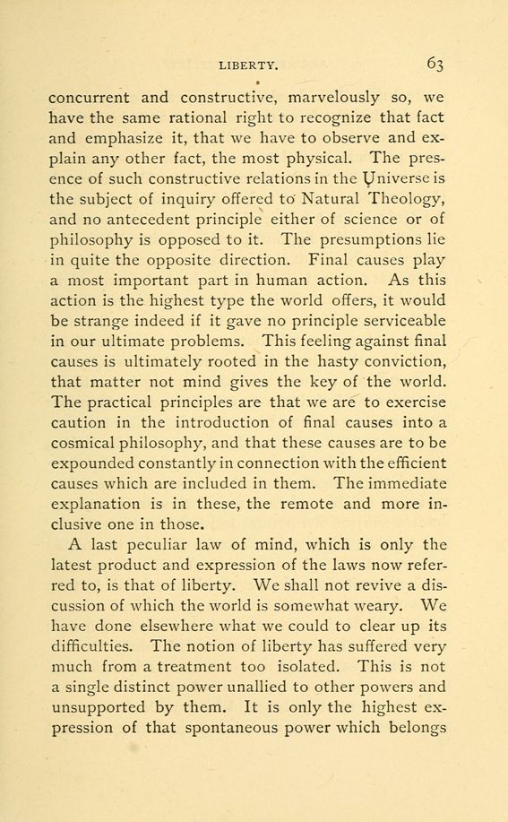 concurrent and constructive, marvelously so, we have the same rational right to recognize that fact and emphasize it, that we have to observe and explain any other fact, the most physical. The presence of such constructive relations in the Universe is the subject of inquiry offered to Natural Theology, and no antecedent principle either of science or of philosophy is opposed to it. The presumptions lie in quite the opposite direction. Final causes play a most important part in human action. As this action is the highest type the world offers, it would be strange indeed if it gave no principle serviceable in our ultimate problems. This feeling against final causes is ultimately rooted in the hasty conviction, that matter not mind gives the key of the world. The practical principles are that we are to exercise caution in the introduction of final causes into a cosmical philosophy, and that these causes are to be expounded constantly in connection with the efficient causes which are included in them. The immediate explanation is in these, the remote and more inclusive one in those.