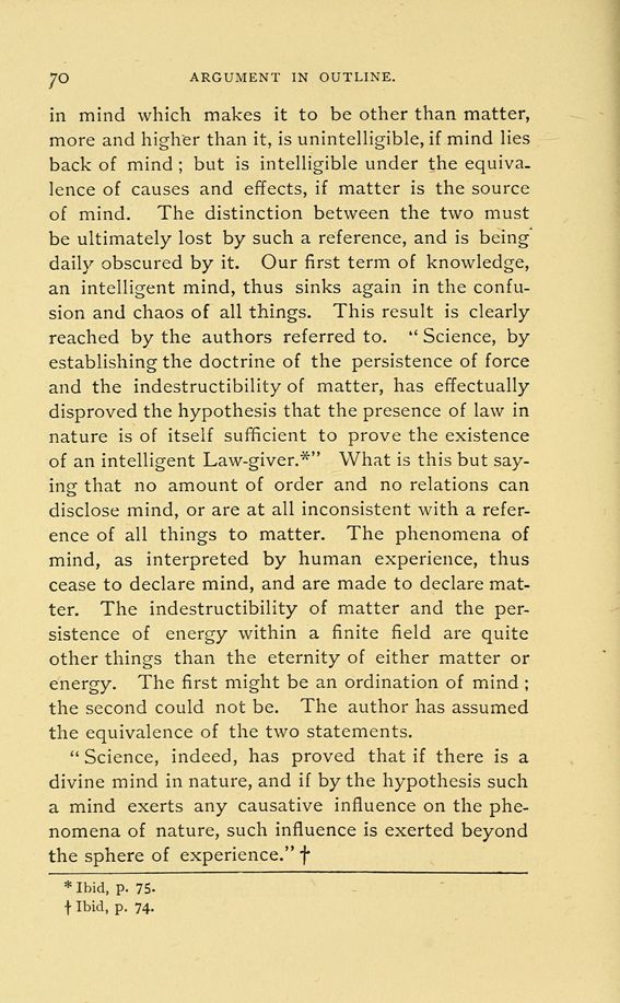 in mind which makes it to be other than matter, more and higher than it, is unintelligible, if mind lies back of mind; but is intelligible under the equivalence of causes and effects, if matter is the source of mind. The distinction between the two must be ultimately lost by such a reference, and is being' daily obscured by it. Our first term of knowledge, an intelligent mind, thus sinks again in the confusion and chaos of all things. This result is clearly reached by the authors referred to. "Science, by establishing the doctrine of the persistence of force and the indestructibility of matter, has effectually disproved the hypothesis that the presence of law in nature is of itself sufficient to prove the existence of an intelligent Law-giver.*" What is this but saying that no amount of order and no relations can disclose mind, or are at all inconsistent with a reference of all things to matter. The phenomena of mind, as interpreted by human experience, thus cease to declare mind, and are made to declare matter. The indestructibility of matter and the persistence of energy within a finite field are quite other things than the eternity of either matter or energy. The first might be an ordination of mind; the second could not be. The author has assumed the equivalence of the two statements.
