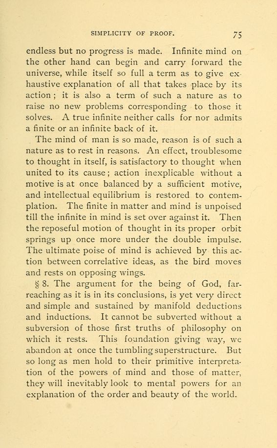§ 8. The argument for the being of God, far-reaching as it is in its conclusions, is yet very direct and simple and sustained by manifold deductions and inductions. It cannot be subverted without a subversion of those first truths of philosophy on which it rests. This foundation giving way, we abandon at once the tumbling superstructure. But so long as men hold to their primitive interpretation of the powers of mind and those of matter, they will inevitably look to mental powers for an explanation of the order and beauty of the world.