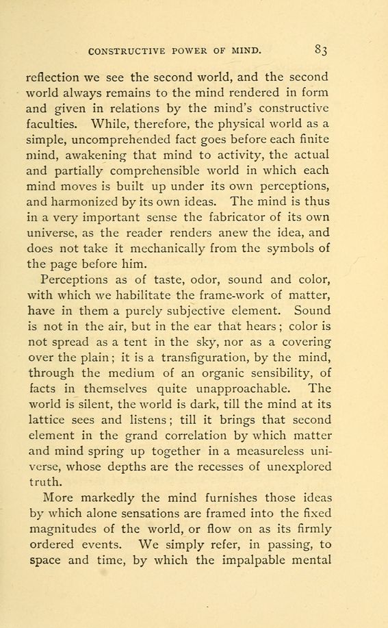 Perceptions as of taste, odor, sound and color, with which we habilitate the frame-work of matter, have in them a purely subjective element. Sound is not in the air, but in the ear that hears; color is not spread as a tent in the sky, nor as a covering over the plain; it is a transfiguration, by the mind, through the medium of an organic sensibility, of facts in themselves quite unapproachable. The world is silent, the world is dark, till the mind at its lattice sees and listens; till it brings that second element in the grand correlation by which matter and mind spring up together in a measureless universe, whose depths are the recesses of unexplored truth.