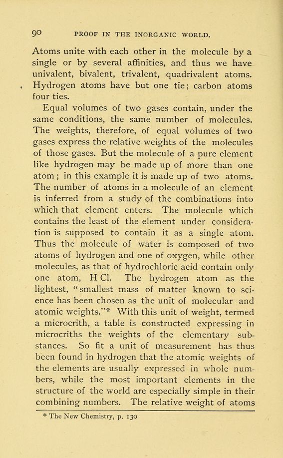 Equal volumes of two gases contain, under the same conditions, the same number of molecules. The weights, therefore, of equal volumes of two gases express the relative weights of the molecules of those gases. But the molecule of a pure element like hydrogen may be made up of more than one atom; in this example it is made up of two atoms. The number of atoms in a molecule of an element is inferred from a study of the combinations into which that element enters. The molecule which contains the least of the element under consideration is supposed to contain it as a single atom. Thus the molecule of water is composed of two atoms of hydrogen and one of oxygen, while other molecules, as that of hydrochloric acid contain only one atom, H Cl. The hydrogen atom as the lightest, "smallest mass of matter known to science has been chosen as the unit of molecular and atomic weights."* With this unit of weight, termed a microcrith, a table is constructed expressing in microcriths the weights of the elementary substances. So fit a unit of measurement has thus been found in hydrogen that the atomic weights of the elements are usually expressed in whole numbers, while the most important elements in the structure of the world are especially simple in their combining numbers. The relative weight of atoms