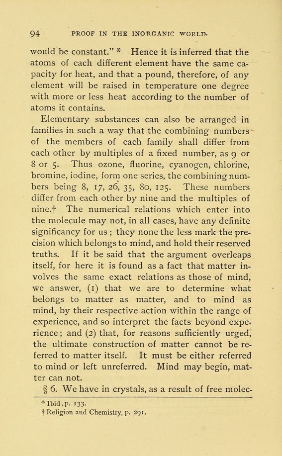 Elementary substances can also be arranged in families in such a way that the combining numbers of the members of each family shall differ from each other by multiples of a fixed number, as 9 or 8 or 5. Thus ozone, fluorine, cyanogen, chlorine, bromine, iodine, form one series, the combining numbers being 8, 17, 26, 35, 80, 125. These numbers differ from each other by nine and the multiples of nine.+ The numerical relations which enter into the molecule may not, in all cases, have any definite significancy for us; they none the less mark the precision which belongs to mind, and hold their reserved truths. If it be said that the argument overleaps itself, for here it is found as a fact that matter involves the same exact relations as those of mind, we answer, (1) that we are to determine what belongs to matter as matter, and to mind as mind, by their respective action within the range of experience, and so interpret the facts beyond experience; and (2) that, for reasons sufficiently urged, the ultimate construction of matter cannot be referred to matter itself. It must be either referred to mind or left unreferred. Mind may begin, matter can not.