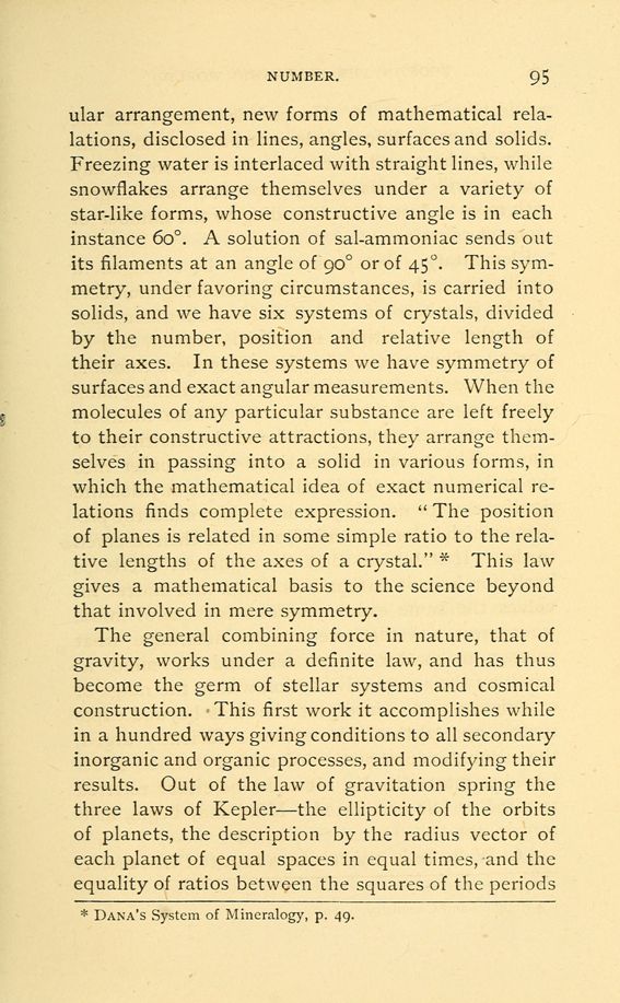 arrangement, new forms of mathematical relations, disclosed in lines, angles, surfaces and solids. Freezing water is interlaced with straight lines, while snowflakes arrange themselves under a variety of star-like forms, whose constructive angle is in each instance 6o°. A solution of sal-ammoniac sends out its filaments at an angle of go° or of 450. This symmetry, under favoring circumstances, is carried into solids, and we have six systems of crystals, divided by the number, position and relative length of their axes. In these systems we have symmetry of surfaces and exact angular measurements. When the molecules of any particular substance are left freely to their constructive attractions, they arrange themselves in passing into a solid in various forms, in which the mathematical idea of exact numerical relations finds complete expression. "The position of planes is related in some simple ratio to the relative lengths of the axes of a crystal."* This law gives a mathematical basis to the science beyond that involved in mere symmetry.
