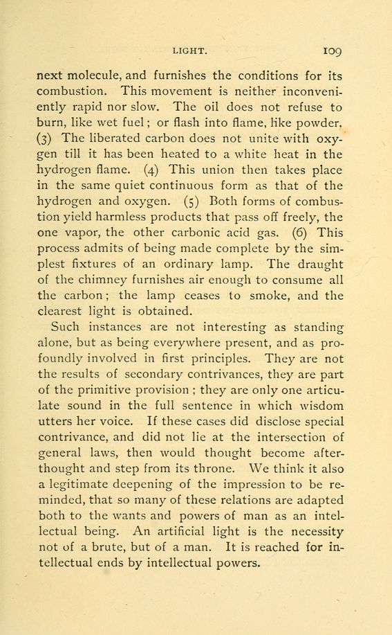 Such instances are not interesting as standing alone, but as being everywhere present, and as profoundly involved in first principles. They are not the results of secondary contrivances, they are part of the primitive provision; they are only one articulate sound in the full sentence in which wisdom utters her voice. If these cases did disclose special contrivance, and did not lie at the intersection of general laws, then would thought become afterthought and step from its throne. We think it also a legitimate deepening of the impression to be reminded, that so many of these relations are adapted both to the wants and powers of man as an intellectual being. An artificial light is the necessity not of a brute, but of a man. It is reached for intellectual ends by intellectual powers.