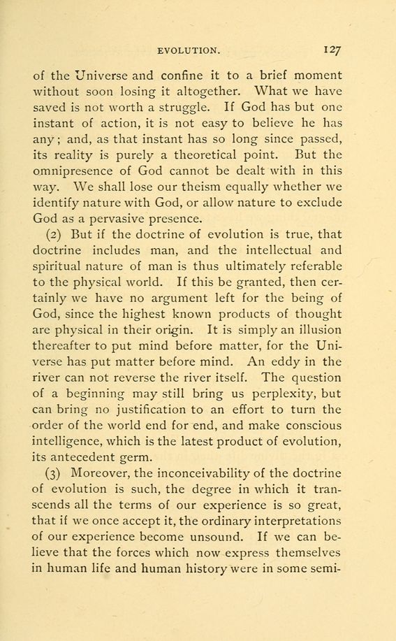 (2) But if the doctrine of evolution is true, that doctrine includes man, and the intellectual and spiritual nature of man is thus ultimately referable to the physical world. If this be granted, then certainly we have no argument left for the being of God, since the highest known products of thought are physical in their origin. It is simply an illusion thereafter to put mind before matter, for the Universe has put matter before mind. An eddy in the river can not reverse the river itself. The question of a beginning may still bring us perplexity, but can bring no justification to an effort to turn the order of the world end for end, and make conscious intelligence, which is the latest product of evolution, its antecedent germ.