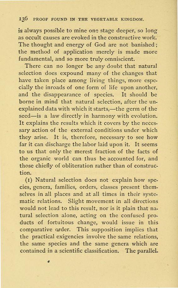 (1) Natural selection does not explain how species, genera, families, orders, classes present themselves in all places and at all times in their systematic relations. Slight movement in all directions would not lead to this result, nor is it plain that natural selection alone, acting on the confused products of fortuitous change, would issue in this comparative Qrder. This supposition implies that the practical exigencies involve the same relations, the same species and the same genera which are contained in a scientific classification. The parallelism