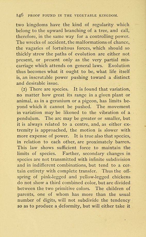 (2) There are species. It is found that variation, no matter how great its range in a given plant or animal, as in a geranium or a pigeon, has limits beyond which it cannot be pushed. The movement in variation may be likened to the vibration of a pendulum. The arc may be greater or smaller, but it is always related to a centre, and, as either extremity is approached, the motion is slower with more expense of power. It is true also that species, in relation to each other, are proximately barren. This law shows sufficient force to maintain the limits of species. Farther, secondary changes in species are not transmitted with infinite subdivision and in indifferent combinations, but tend to a certain entirety with complete transfer. Thus the offspring of pink-legged and yellow-legged chickens do not show a third combined color, but are divided between the two primitive colors. The children of parents, one of whom has more than the usual number of digits, will not subdivide the tendency so as to produce a deformity, but will either take it