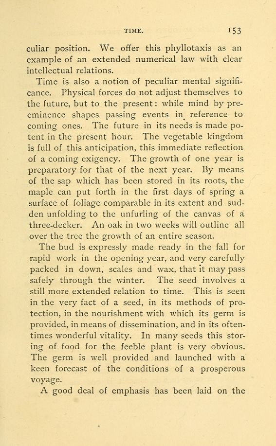 This law of phyllotaxis is certainly a curious and interesting one. It seems to involve a direct and subtile recognition of complicated numerical relations. It has been suggested that this disposition of leaves on a stem would secure the best exposure of each to the light, and, therefore, once occurring, could be laid hold of and perpetuated by natural selection. This is an explanation of the feeblest character. It hardly yields a shimmer of light. It gives no attention to the immense improbability that such an arrangement should occur, not merely in one plant, but generally, in various yet allied ratios, throughout the vegetable kingdom; and it attaches a preposterous value to it in the struggle for life. The leaves on a stem soon fall away, and are not so crowded as to make their precise arrangement a matter of moment in securing light. In most trees, owing to the irregular development of buds, all trace of the law disappears in the tree as a composite whole. In cones, as those of the pine, and in discs, as those of the sun-flower, the arrangement is one simply of interest to the eye, as much so as the corresponding lines of chasing on the back of one's watch. The scales and seeds in each case are set closely, and gain little in light by their peculiar