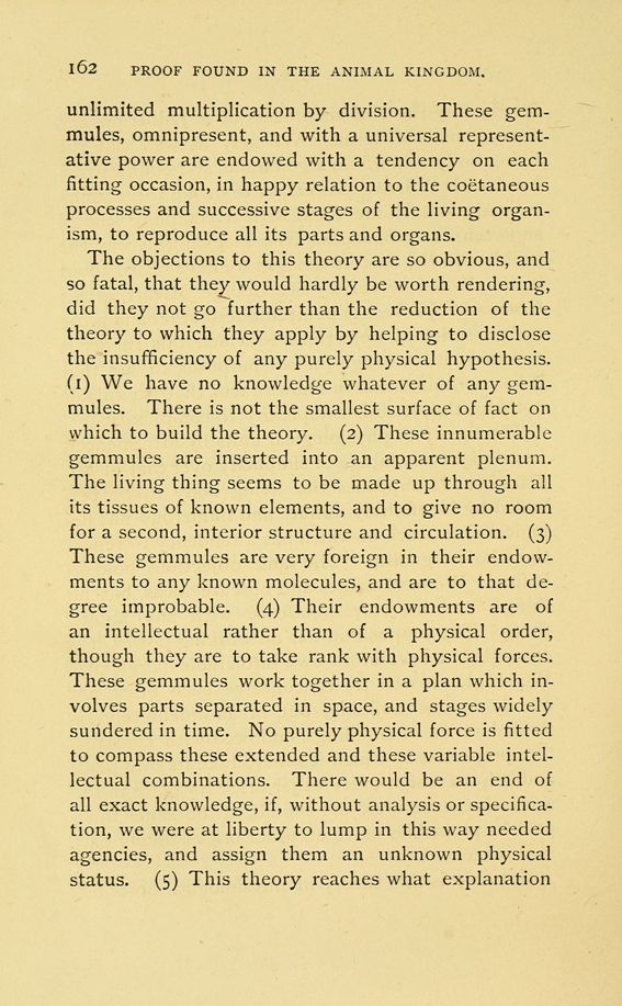 The objections to this theory are so obvious, and so fatal, that they would hardly be worth rendering, did they not go further than the reduction of the theory to which they apply by helping to disclose the insufficiency of any purely physical hypothesis. (1) We have no knowledge whatever of any gem-mules. There is not the smallest surface of fact on which to build the theory. (2) These innumerable gemmules are inserted into an apparent plenum. The living thing seems to be made up through all its tissues of known elements, and to give no room for a second, interior structure and circulation. (3) These gemmules are very foreign in their endowments to any known molecules, and are to that degree improbable. (4) Their endowments are of an intellectual rather than of a physical order, though they are to take rank with physical forces. These gemmules work together in a plan which involves parts separated in space, and stages widely sundered in time. No purely physical force is fitted to compass these extended and these variable intellectual combinations. There would be an end of all exact knowledge, if, without analysis or specification, we were at liberty to lump in this way needed agencies, and assign them an unknown physical status. (5) This theory reaches what explanation