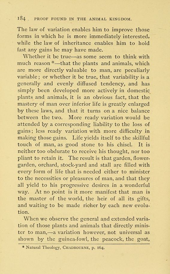 Whether it be true --- as some seem to think with much reason * --- that the plants and animals, which are more directly valuable to man, are peculiarly variable; or whether it be true, that variability is a generally and evenly diffused tendency, and has simply been developed more actively in domestic plants and animals, it is an obvious fact, that the mastery of man over inferior life is greatly enlarged by these laws, and that it turns on a nice balance between the two. More ready variation would be attended by a corresponding liability to the loss of gains; less ready variation with more difficulty in making those gains. Life yields itself to the skillful touch of man, as good stone to his chisel. It is neither too obdurate to receive his thought, nor too pliant to retain it. The result is that garden, flower-garden, orchard, stock-yard and stall are filled with every form of life that is needed either to minister to the necessities or pleasures of man, and that they all yield to his progressive desires in a wonderful way. At no point is it more manifest that man is the master of the world, the heir of all its gifts, and waiting to be made richer by each new evolution.