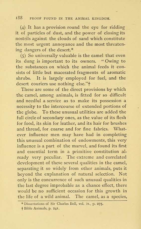 These are some of the direct provisions by which the camel, among animals, is fitted for so difficult and needful a service as to make its possession a necessity to the intercourse of extended portions of the globe. To these unusual utilities are added the full circle of secondary ones, as the value of its flesh for food, its skin for leather, and its hair for brushes and thread, for coarse and for fine fabrics. Whatever influence men may have had in completing this unusual combination of endowments, this very influence is a part of the marvel, and found its first and essential term in a primitive constitution already very peculiar. The extreme and correlated development of these several qualities in the camel, separating it so widely from other animals, puts it beyond the explanation of natural selection. Not only is the concurrence of such unusual qualities in the last degree improbable as a chance effect, there would be no sufficient occasion for this growth in the life of a wild animal. The camel, as a species,
