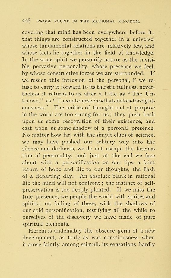 that mind has been everywhere before it; that things are constructed together in a universe, whose fundamental relations are relatively few, and whose facts lie together in the field of knowledge. In the same spirit we personify nature as the invisible, pervasive personality, whose presence we feel, by whose constructive forces we are surrounded. If we resent this intrusion of the personal, if we refuse to carry it forward to its theistic fullness, nevertheless it returns to us after a little as "The Unknown," as "The-not-ourselves-that-makes-for-righteousness." The unities of thought and of purpose in the world are too strong for us; they push back upon us some recognition of their existence, and cast upon us some shadow of a personal presence. No matter how far, with the simple clues of science, we may have pushed our solitary way into the silence and darkness, we do not escape the fascination of personality, and just at the end we face about with a personification on our lips, a faint return of hope and life to our thoughts, the flash of a departing day. An absolute blank in rational life the mind will not confront; the instinct of self-preservation is too deeply planted. If we miss the true presence, we people the world with sprites and spirits; or, failing of these, with the shadows of our cold personification, testifying all the while to ourselves of the discovery we have made of pure spiritual elements.
