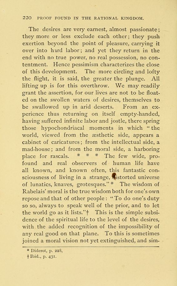 The desires are very earnest, almost passionate; they more or less exclude each other; they push exertion beyond the point of pleasure, carrying it over into hard labor; and yet they return in the end with no true power, no real possession, no contentment. Hence pessimism characterizes the close of this development. The more circling and lofty the flight, it is said, the greater the plunge. All lifting up is for this overthrow. We may readily grant the assertion, for our lives are not to be floated on the swollen waters of desires, themselves to be swallowed up in arid deserts. From an experience thus returning on itself empty-handed, having suffered infinite labor and jostle, there spring those hypochondriacal moments in which "the world, viewed from the aesthetic side, appears a cabinet of caricatures; from the intellectual side, a mad-house; and from the moral side, a harboring place for rascals. * * * The few wide, profound and real observers of human life have all known, and known often, this fantastic consciousness of living in a strange, distorted universe of lunatics, knaves, grotesques." * The wisdom of Rabelais' moral is the true wisdom both for one's own repose and that of other people: "To do one's duty so so, always to speak well of the prior, and to let the world go as it lists."+ This is the simple subsidence of the spiritual life to the level of the desires, with the added recognition of the impossibility of any real good on that plane. To this is sometimes joined a moral vision not yet extinguished, and simply