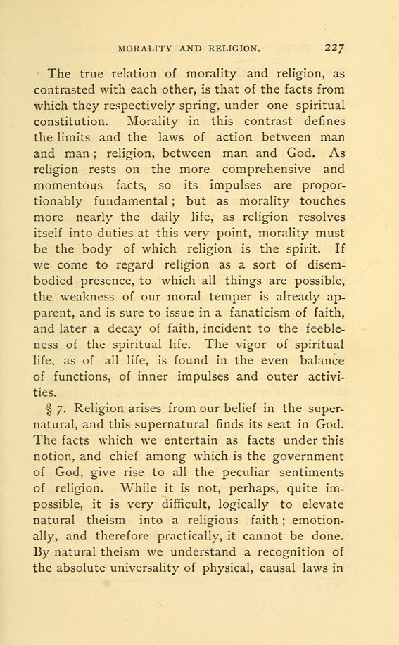 § 7. Religion arises from our belief in the supernatural, and this supernatural finds its seat in God. The facts which we entertain as facts under this notion, and chief among which is the government of God, give rise to all the peculiar sentiments of religion. While it is not, perhaps, quite impossible, it is very difficult, logically to elevate natural theism into a religious faith emotionally, and therefore practically, it cannot be done. By natural theism we understand a recognition of the absolute universality of physical, causal laws in