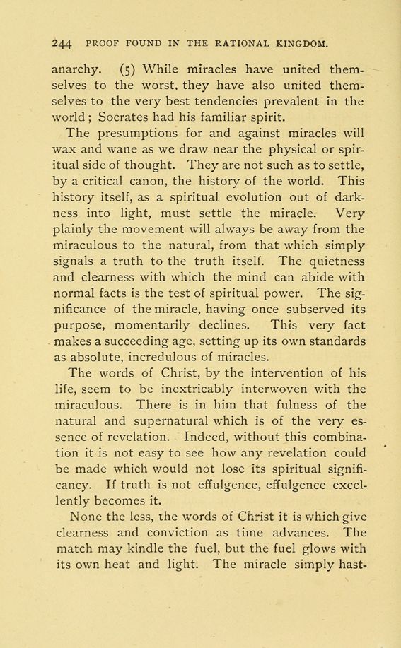 anarchy. (5) While miracles have united themselves to the worst, they have also united themselves to the very best tendencies prevalent in the world; Socrates had his familiar spirit.