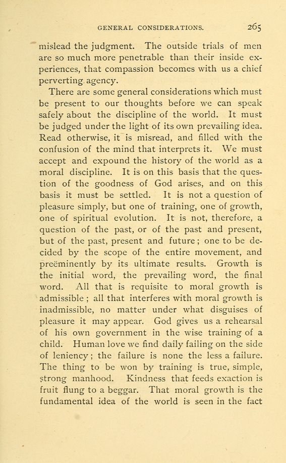 There are some general considerations which must be present to our thoughts before we can speak safely about the discipline of the world. It must be judged under the light of its own prevailing idea. Read otherwise, it is misread, and filled with the confusion of the mind that interprets it. We must accept and expound the history of the world as a moral discipline. It is on this basis that the question of the goodness of God arises, and on this basis it must be settled. It is not a question of pleasure simply, but one of training, one of growth, one of spiritual evolution. It is not, therefore, a question of the past, or of the past and present, but of the past, present and future; one to be decided by the scope of the entire movement, and preeminently by its ultimate results. Growth is the initial word, the prevailing word, the final word. .All that is requisite to moral growth is admissible; all that interferes with moral growth is inadmissible, no matter under what disguises of pleasure it may appear. God gives us a rehearsal of his own government in the wise training of a child. Human love we find daily failing on the side of leniency; the failure is none the less a failure. The thing to be won by training is true, simple, strong manhood. Kindness that feeds exaction is fruit flung to a beggar. That moral growth is the fundamental idea of the world is seen in the fact
