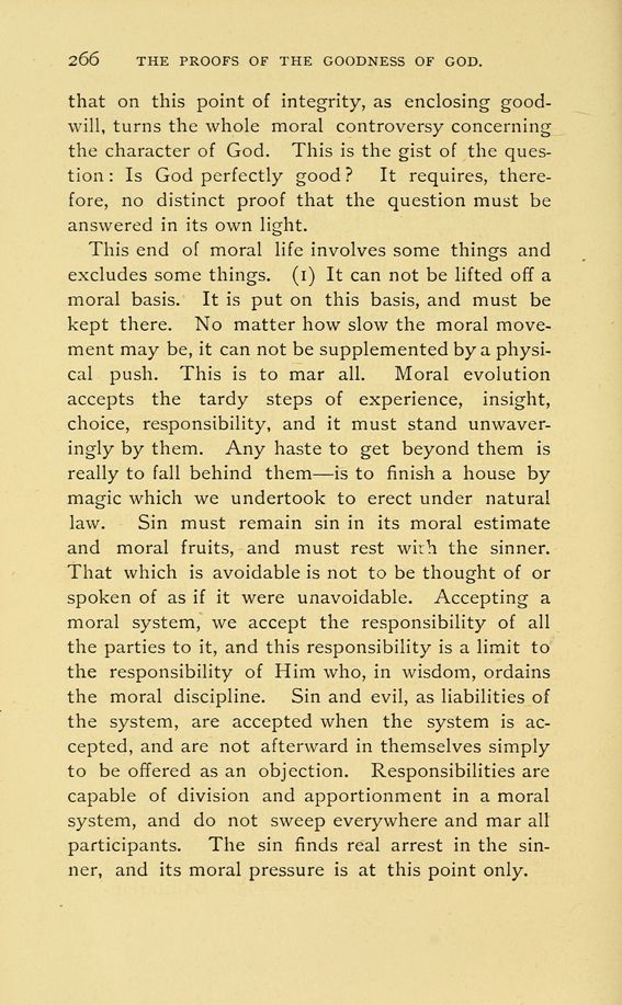 This end of moral life involves some things and excludes some things. (1) It can not be lifted off a moral basis. It is put on this basis, and must be kept there. No matter how slow the moral movement may be, it can not be supplemented by a physical push. This is to mar all. Moral evolution accepts the tardy steps of experience, insight, choice, responsibility, and it must stand unwaveringly by them. Any haste to get beyond them is really to fall behind them --- is to finish a house by magic which we undertook to erect under natural law. Sin must remain sin in its moral estimate and moral fruits, and must rest with the sinner. That which is avoidable is not to be thought of or spoken of as if it were unavoidable. Accepting a moral system, we accept the responsibility of all the parties to it, and this responsibility is a limit to the responsibility of Him who, in wisdom, ordains the moral discipline. Sin and evil, as liabilities of the system, are accepted when the system is accepted, and are not afterward in themselves simply to be offered as an objection. Responsibilities are capable of division and apportionment in a moral system, and do not sweep everywhere and mar all participants. The sin finds real arrest in the sinner, and its moral pressure is at this point only.