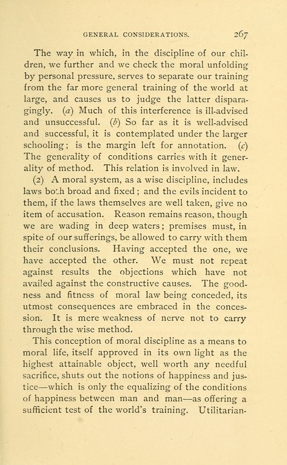 The way in which, in the discipline of our children, we further and we check the moral unfolding by personal pressure, serves to separate our training from the far more general training of the world at large, and causes us to judge the latter disparagingly. (a) Much of this interference is ill-advised and unsuccessful. (b) So far as it is well-advised and successful, it is contemplated under the larger schooling; is the margin left for annotation. (c) The generality of conditions carries with it generality of method. This relation is involved in law.