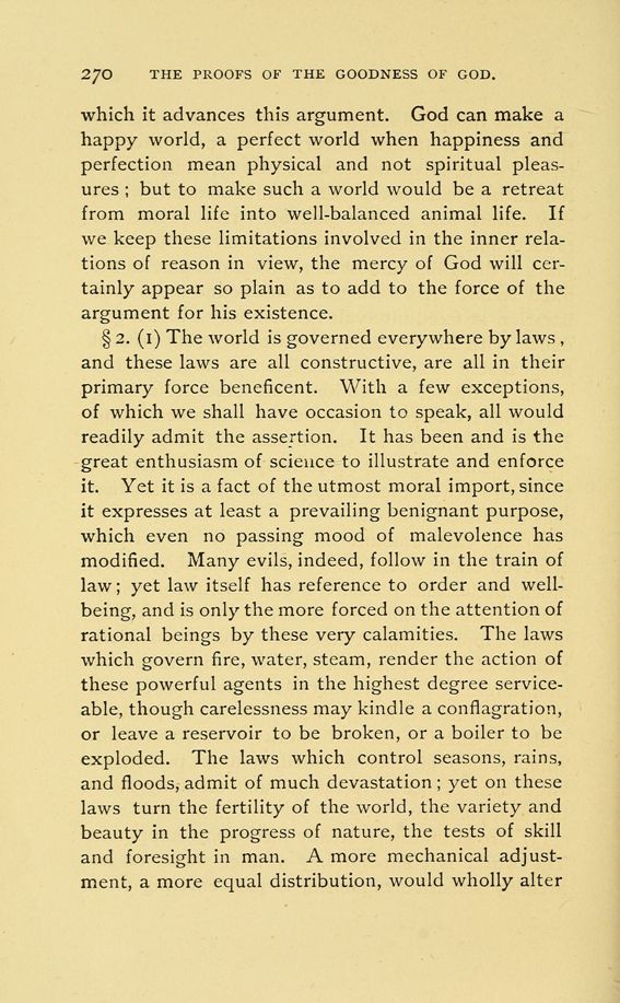 § 2. (1) The world is governed everywhere by laws , and these laws are all constructive, are all in their primary force beneficent. With a few exceptions, of which we shall have occasion to speak, all would readily admit the assertion. It has been and is the great enthusiasm of science to illustrate and enforce it. Yet it is a fact of the utmost moral import, since it expresses at least a prevailing benignant purpose, which even no passing mood of malevolence has modified. Many evils, indeed, follow in the train of law; yet law itself has reference to order and wellbeing, and is only the more forced on the attention of rational beings by these very calamities. The laws which govern fire, water, steam, render the action of these powerful agents in the highest degree serviceable, though carelessness may kindle a conflagration, or leave a reservoir to be broken, or a boiler to be exploded. The laws which control seasons, rains, and floods, admit of much devastation; yet on these laws turn the fertility of the world, the variety and beauty in the progress of nature, the tests of skill and foresight in man. A more mechanical adjustment, a more equal distribution, would wholly alter