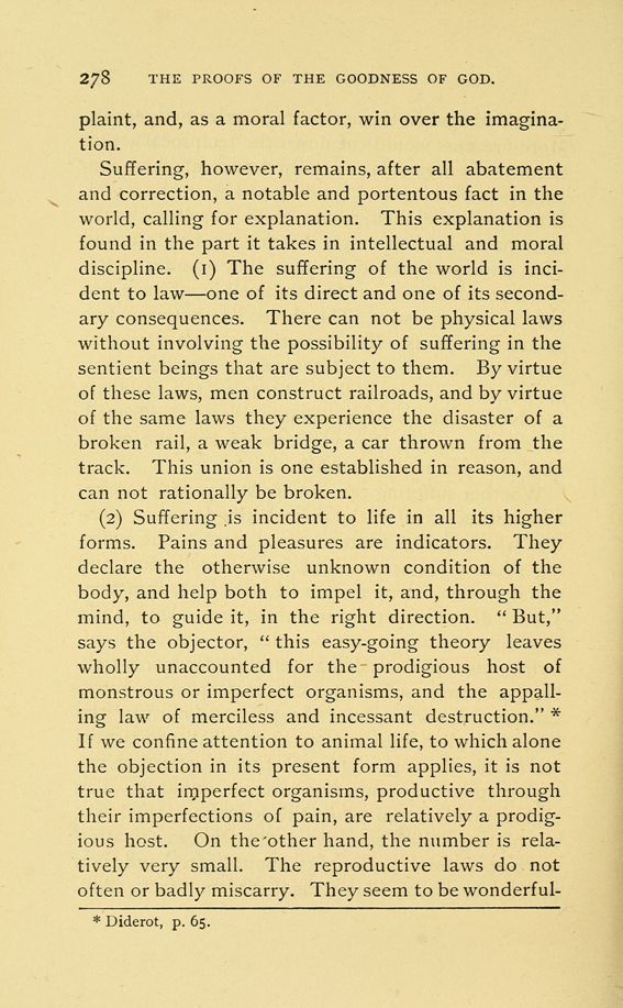 Suffering, however, remains, after all abatement and correction, a notable and portentous fact in the world, calling for explanation. This explanation is found in the part it takes in intellectual and moral discipline. (1) The suffering of the world is incident to law --- one of its direct and one of its secondary consequences. There can not be physical laws without involving the possibility of suffering in the sentient beings that are subject to them. By virtue of these laws, men construct railroads, and by virtue of the same laws they experience the disaster of a broken rail, a weak bridge, a car thrown from the track. This union is one established in reason, and can not rationally be broken.