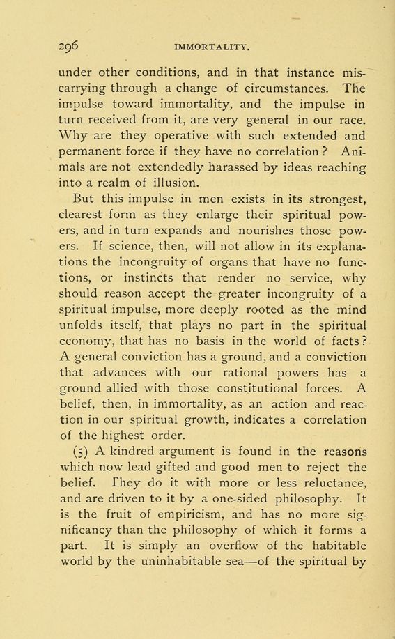 (5) A kindred argument is found in the reasons which now lead gifted and good men to reject the belief. they do it with more or less reluctance, and are driven to it by a one-sided philosophy. It is the fruit of empiricism, and has no more significancy than the philosophy of which it forms a part. It is simply an overflow of the habitable world by the uninhabitable sea --- of the spiritual by