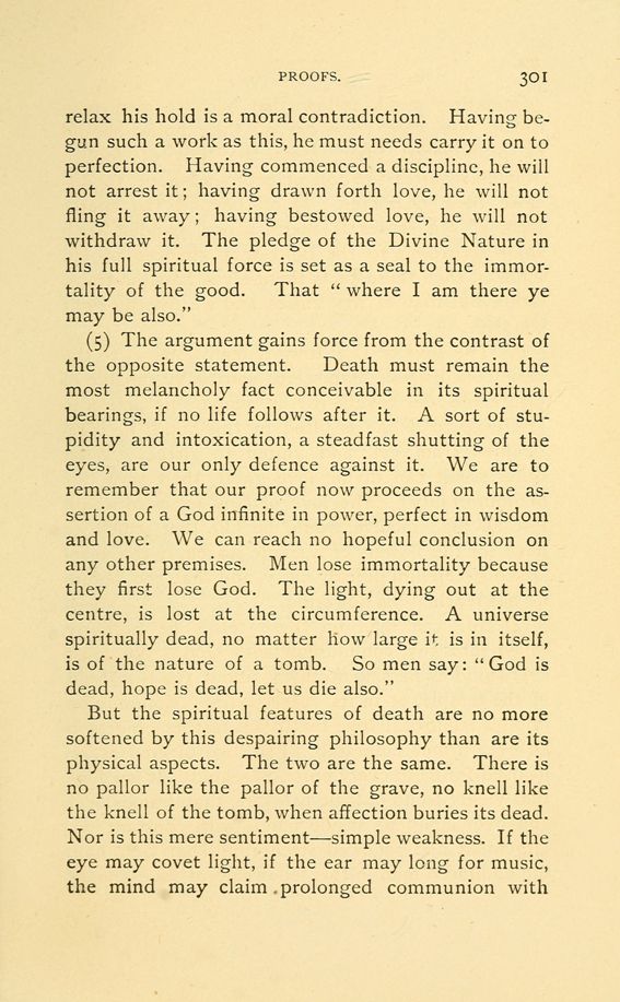 (5) The argument gains force from the contrast of the opposite statement. Death must remain the most melancholy fact conceivable in its spiritual bearings, if no life follows after it. A sort of stupidity and intoxication, a steadfast shutting of the eyes, are our only defence against it. We are to remember that our proof now proceeds on the assertion of a God infinite in power, perfect in wisdom and love. We can reach no hopeful conclusion on any other premises. Men lose immortality because they first lose God. The light, dying out at the centre, is lost at the circumference. A universe spiritually dead, no matter how large it is in itself, is of the nature of a tomb. So men say: "God is dead, hope is dead, let us die also."