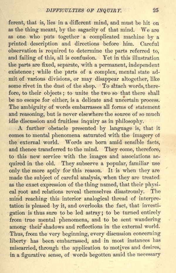 A further obstacle presented by language is, that it comes to mental phenomena saturated with the imagery of the external world. Words are born amid sensible facts, and thence transferred to the mind. They come, therefore, to this new service with the images and associations acquired in the old. They subserve a popular, familiar use only the more aptly for this reason. It is when they are made the subject of careful analysis, when they are treated as the exact expression of the thing named, that their physical root and relations reveal themselves disastrously. The mind reaching this interior analogical thread of interpretation is pleased by it, and overlooks the fact, that investigation is thus sure to be led astray; to be turned entirely from true mental phenomena, and to be sent wandering among their shadows and reflections in the external world. Thus, from the very beginning, every discussion concerning liberty has been embarrassed, and in most instances has miscarried, through the application to motives and desires, in a figurative sense, of words begotten amid the necessary