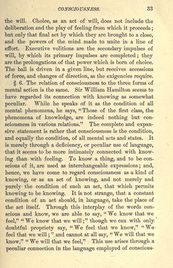 6. The relation of consciousness to the three forms of mental action is the same. Sir William Hamilton seems to have regarded its connection with knowing as somewhat peculiar. While he speaks of it as the condition of all mental phenomena, he says, "Those of the first class, the phenomena of knowledge, are indeed nothing but consciousness in various relations." The complete and expansive statement is rather that consciousness is the condition, and equally the condition, of all mental acts and states. It is merely through a deficiency, or peculiar use of language, that it seems to be more intimately connected with knowing than with feeling. To know a thing, and to be conscious of it, are used as interchangeable expressions; and, hence, we have come to regard consciousness as a kind of knowing, or as an act of knowing, and not merely and purely the condition of such an act, that which permits knowing to be knowing. It is not strange, that a constant condition of an act should, in language, take the place of the act itself. Through this interplay of the words conscious and know, we are able to say, " We know that we feel," "We know that we will; " though we can with only, doubtful propriety say, "We feel that we know," "We feel that we will;'' and cannot at all say, "We will that we know," "We will that we feel," This use arises through a peculiar connection in the language employed of consciousness
